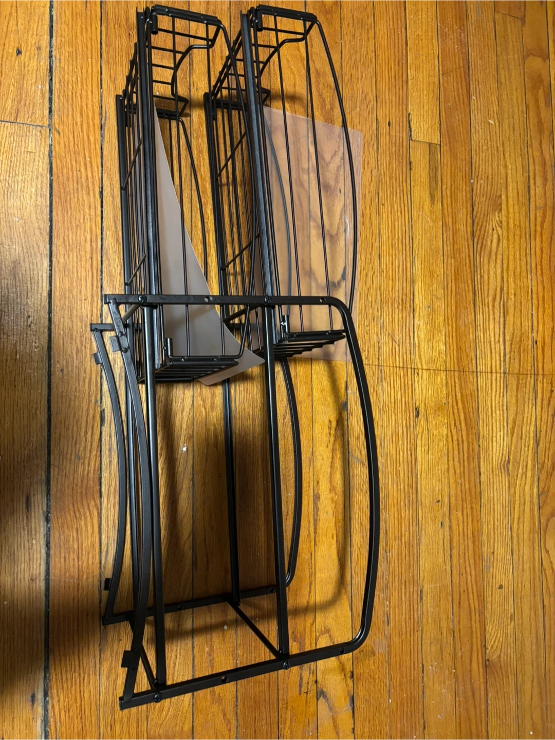 This is a 2-tier metal wire storage basket. It's black and has a modern design. The basket is great for organizing various items in your home or office!