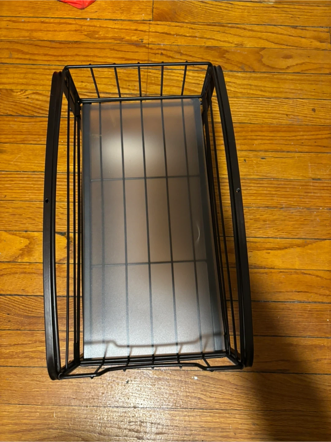This is a 2-tier metal wire storage basket. It's black and has a modern design. The basket is great for organizing various items in your home or office!