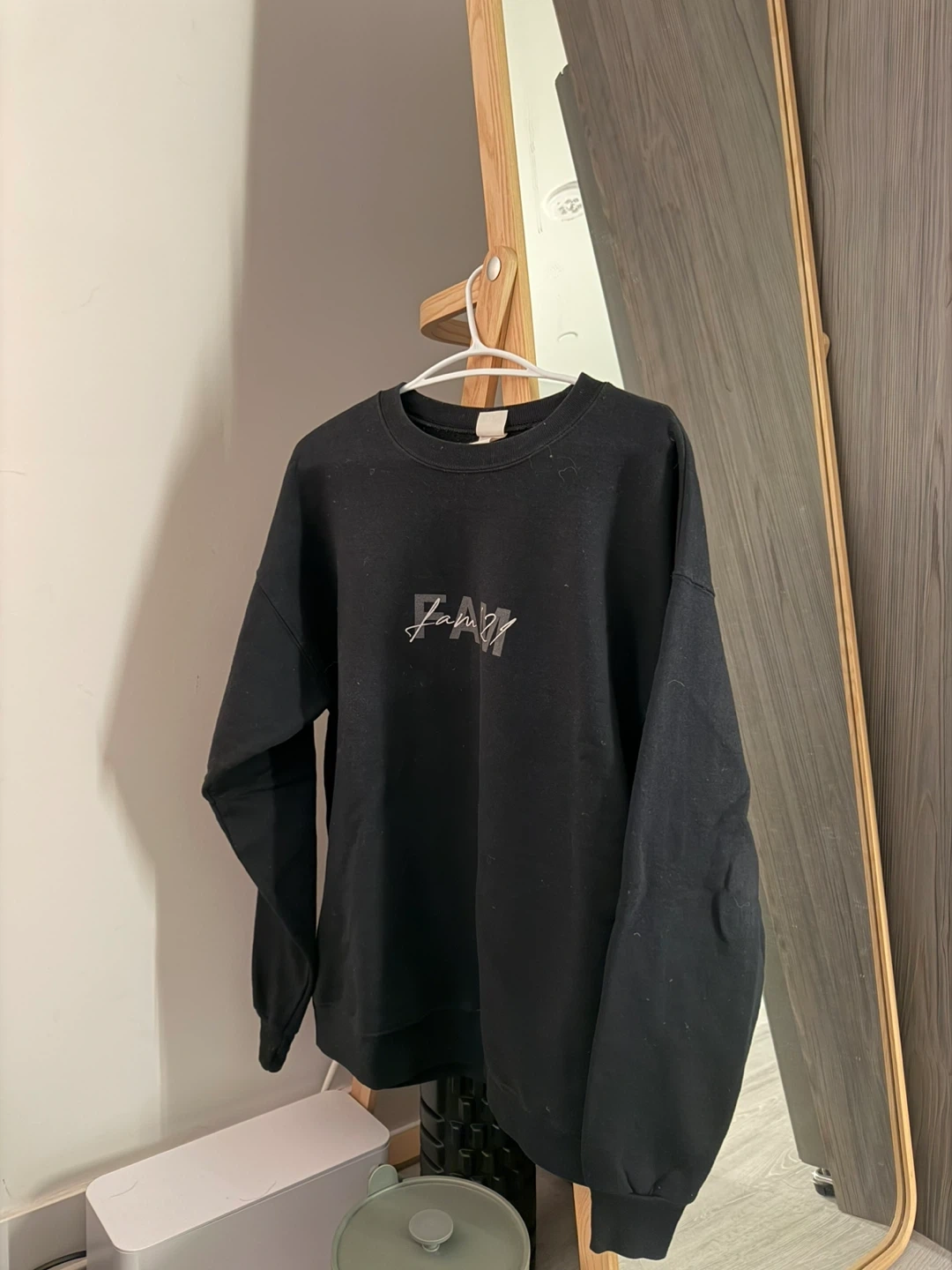 This is a black crewneck sweatshirt with a grey "ZAVY" logo across the chest. It's made of a soft cotton blend for comfort. Perfect for casual wear on cooler days!