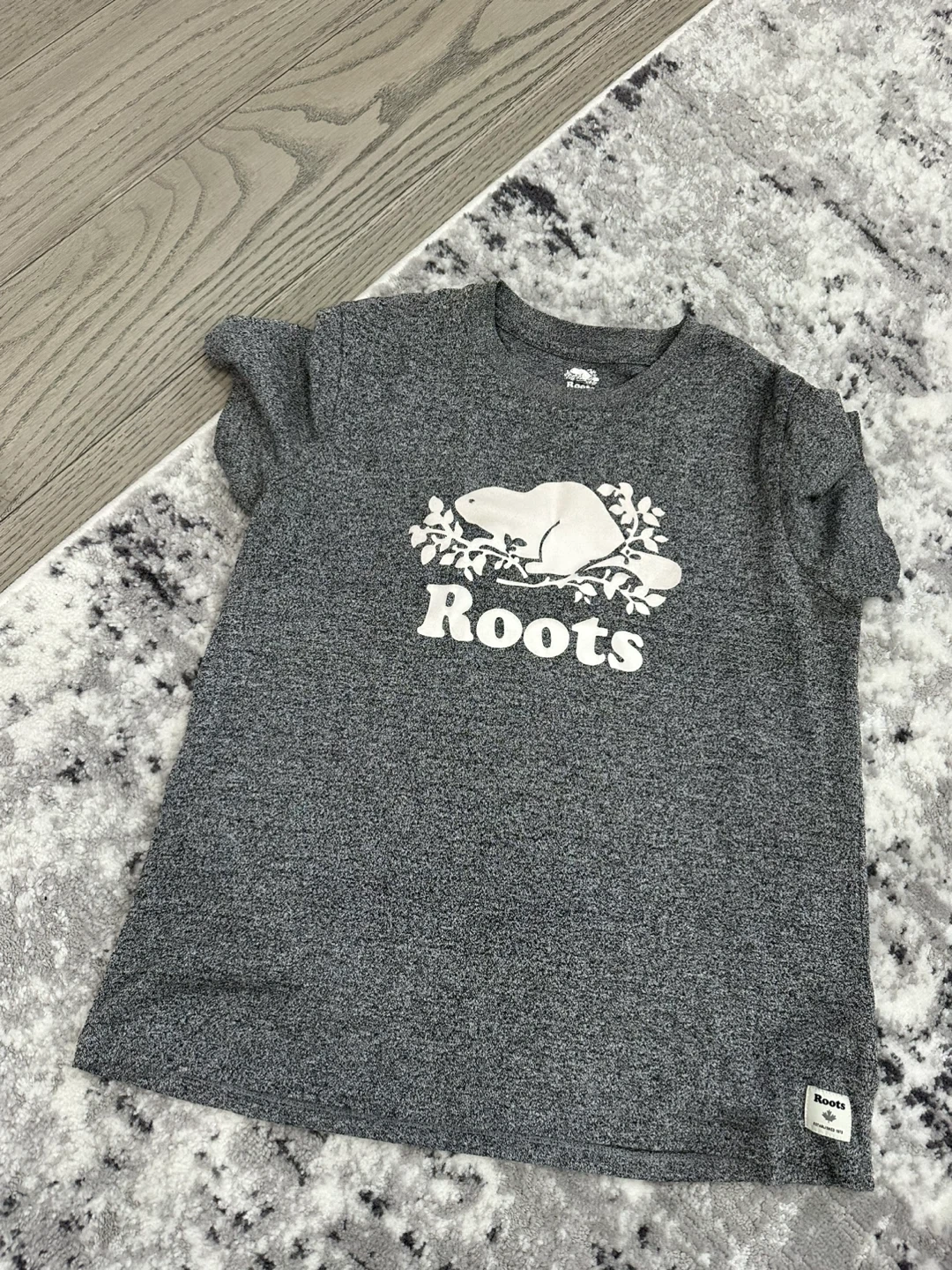 This is a Roots t-shirt featuring their classic beaver logo. It's a heather grey colour. This shirt is suitable for everyday wear.