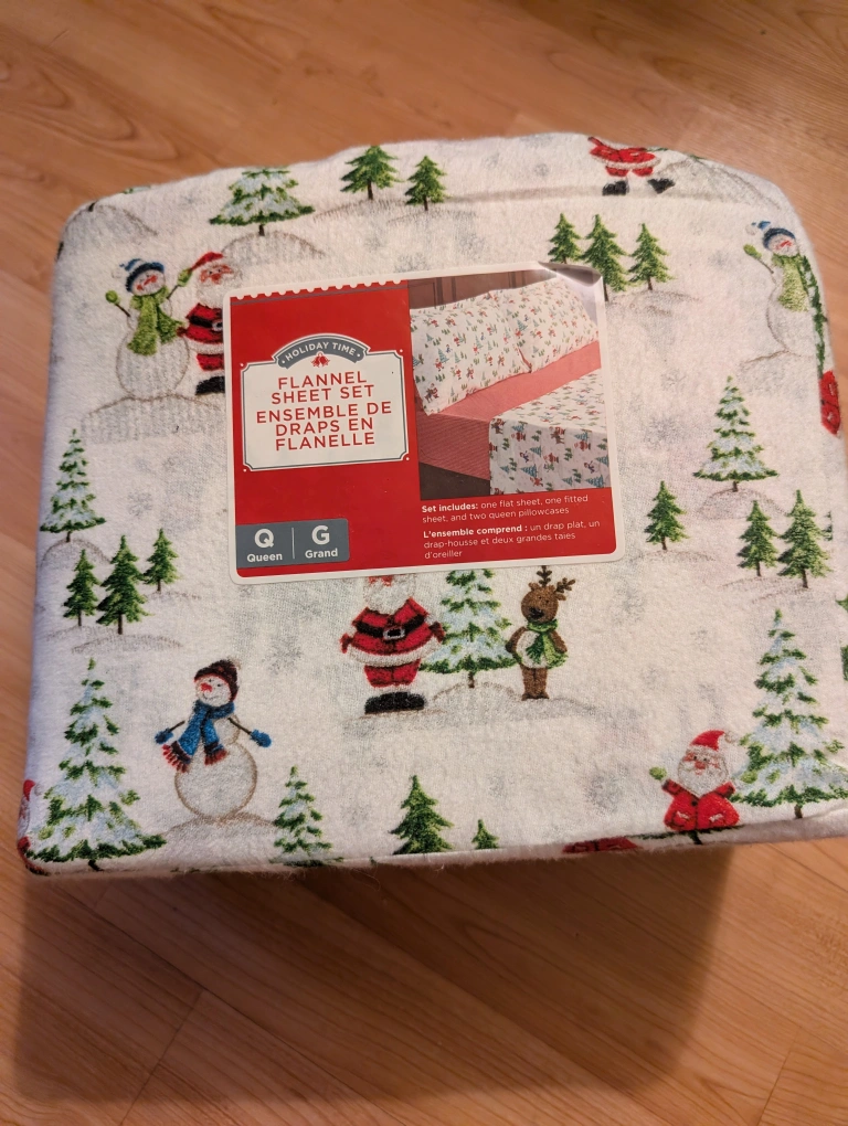 Selling a Holiday Time flannel sheet set, queen size! The set includes one flat sheet, one fitted sheet, and two queen pillowcases. Perfect for the holidays!