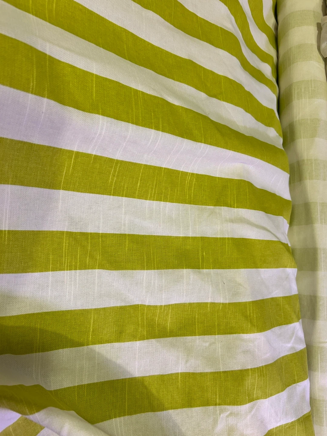Roll of fabric with white and lime green stripes. It's a woven material. This fabric would be useful for crafting or upholstery projects.