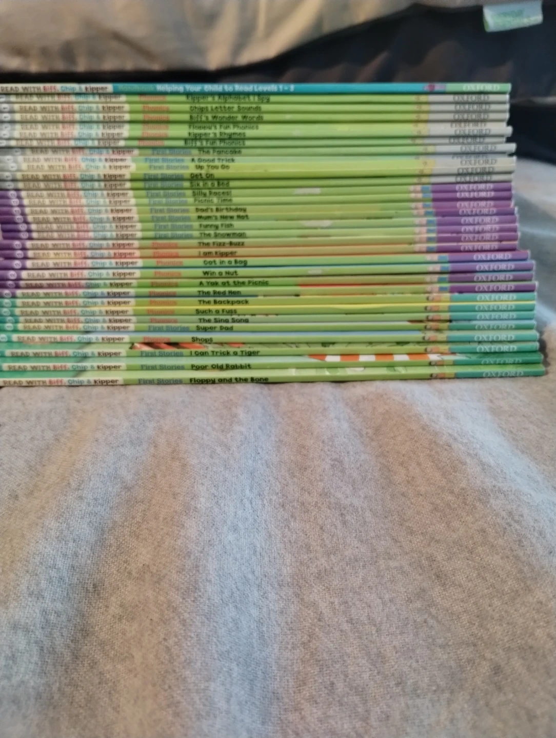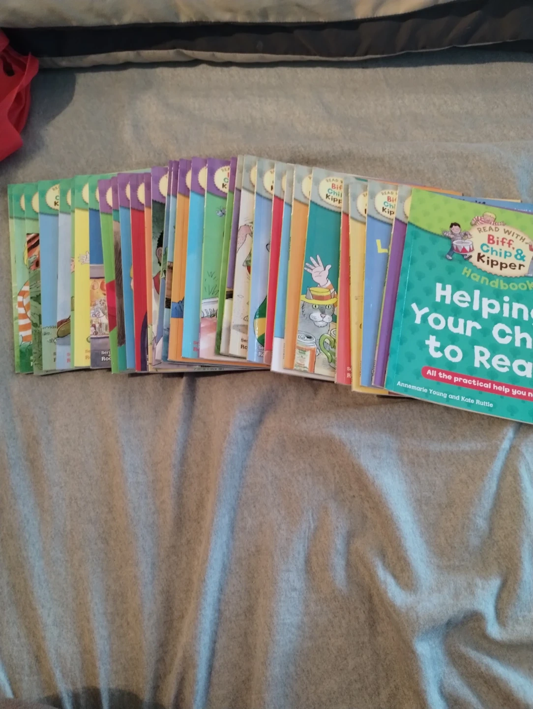 A collection of "Read with Biff, Chip & Kipper" books, including a handbook and various levels. These books are great for helping children develop their reading skills. Includes titles like "Kipper's Alphabet I Spy" and "Floppy's Fun Phonics".