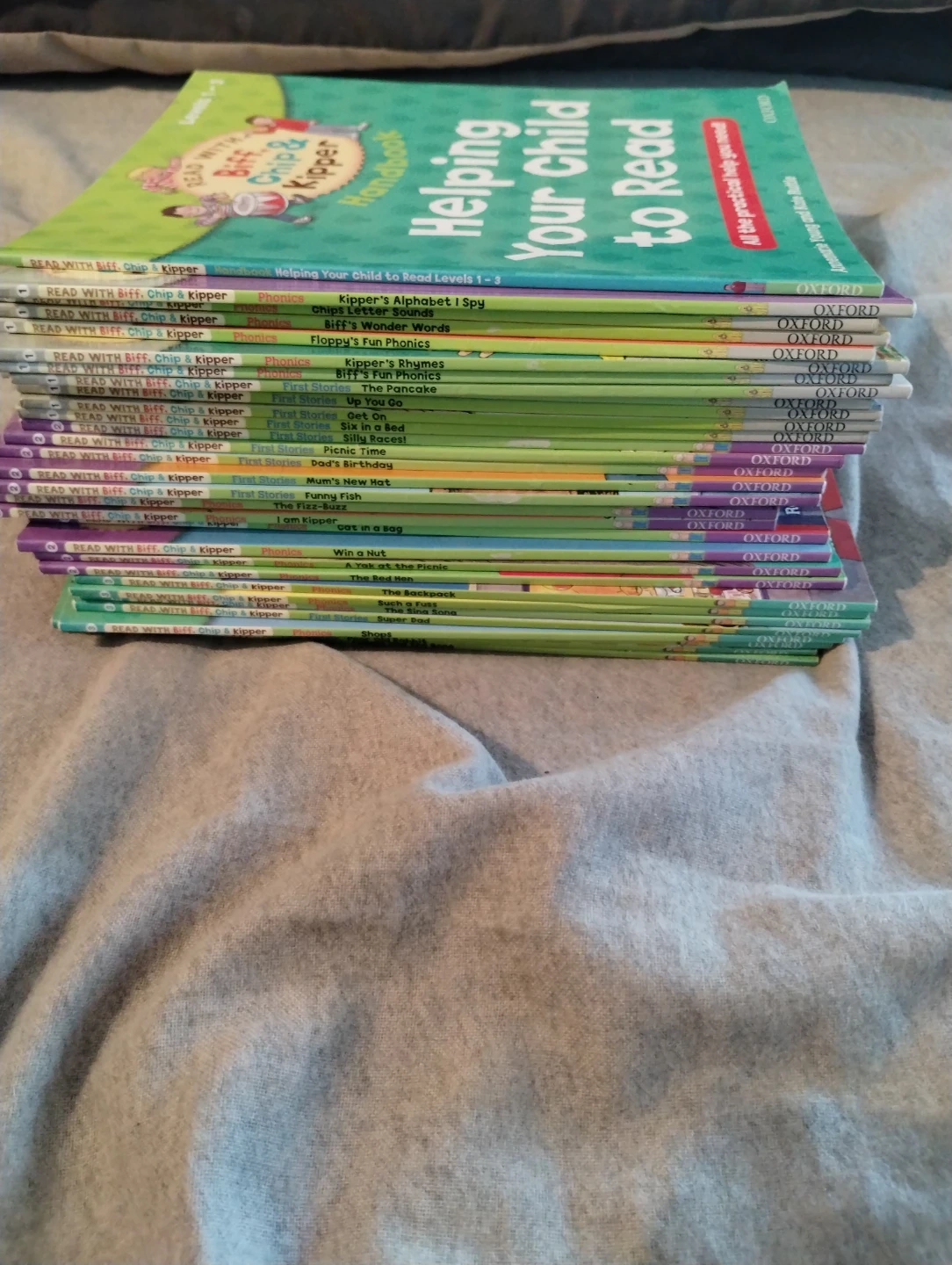 A collection of "Read with Biff, Chip & Kipper" books, including a handbook and various levels. These books are great for helping children develop their reading skills. Includes titles like "Kipper's Alphabet I Spy" and "Floppy's Fun Phonics".