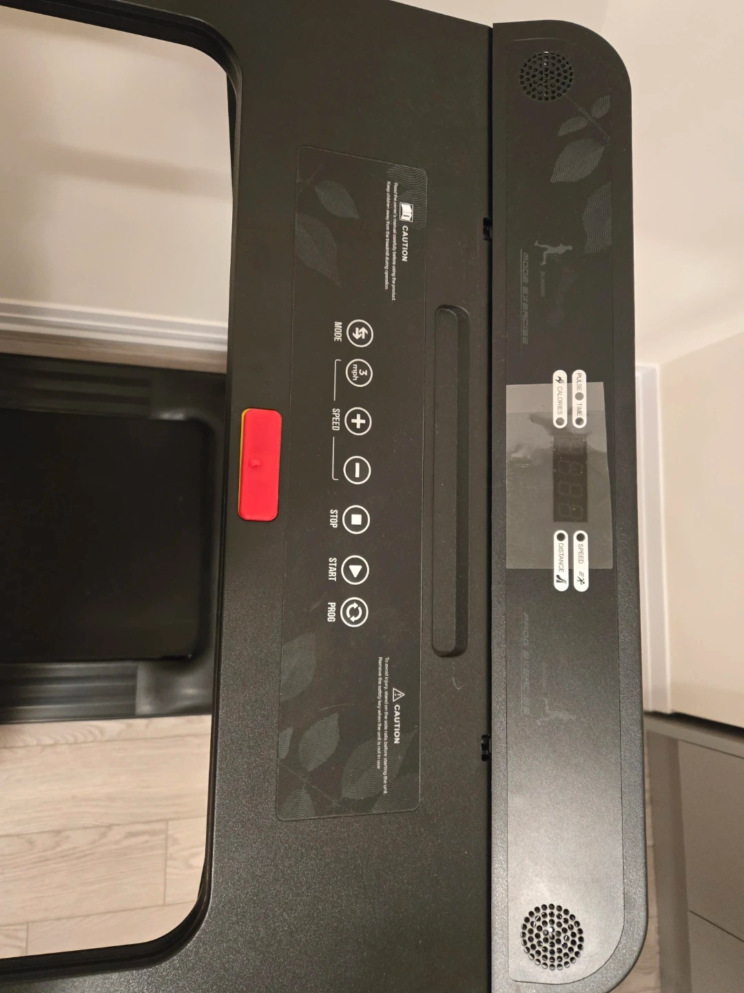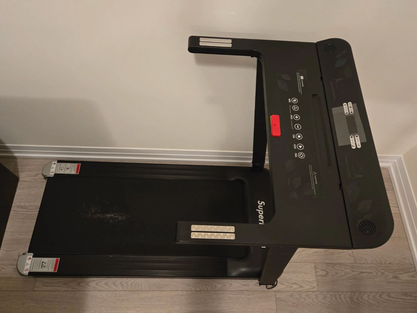 Selling a SuperFit folding treadmill in black. It's in great condition and perfect for small spaces. Folds up easily for storage when not in use. Get your steps in at home!