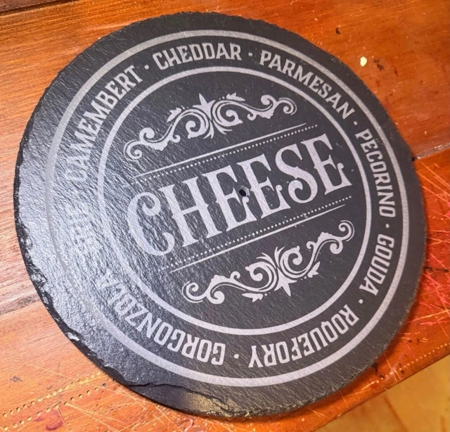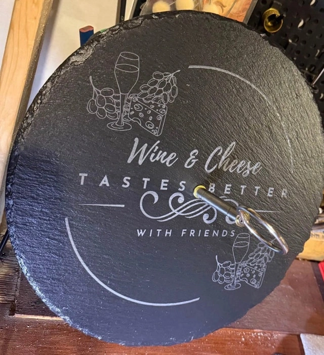 Turn heads at your next gathering with a custom engraved slate serving tray! Perfect for wine & cheese nights, housewarming gifts, weddings & anniversaries, or entertaining guests in style. Each tray is laser engraved for a clean, permanent finish. Natural slate with rustic edges for a premium look. Custom designs available (names, logos, sayings). Food-safe & easy to clean. Includes metal handle (tiered tray style). Your design or choose from ready-made styles like: “Wine & Cheese Tastes Better With Friends”, Cheese selection board, or custom logos/business branding. Let me know if you're interested!