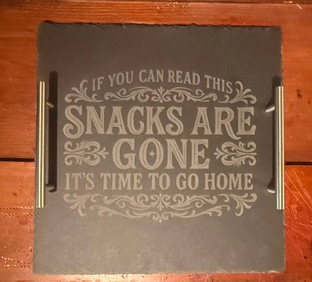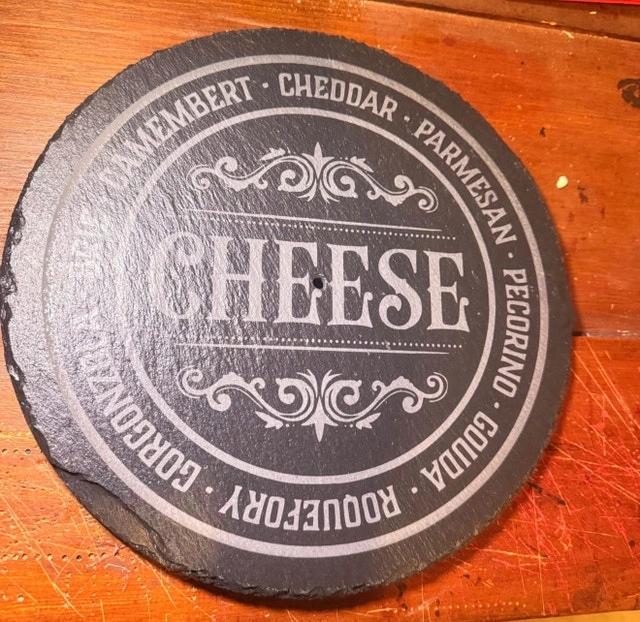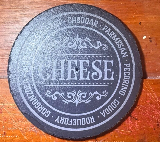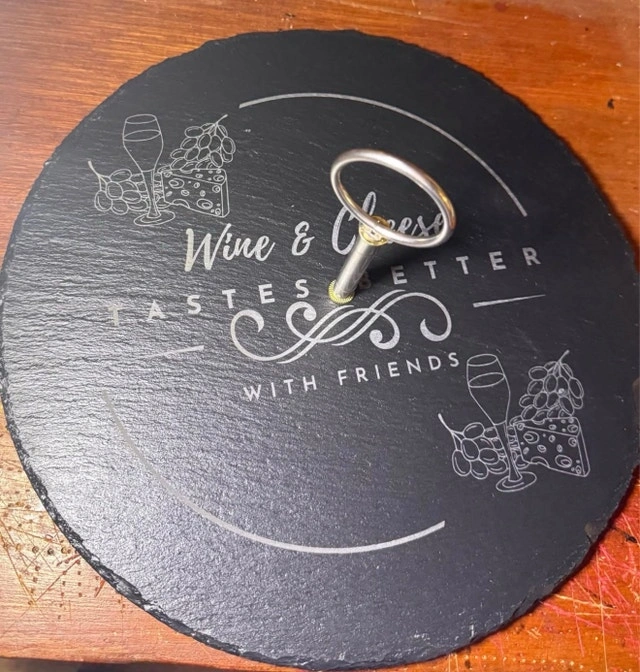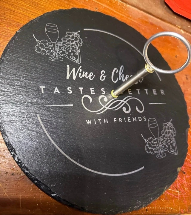 Turn heads at your next gathering with a custom engraved slate serving tray! Perfect for wine & cheese nights, housewarming gifts, weddings & anniversaries, or entertaining guests in style. Each tray is laser engraved for a clean, permanent finish. Natural slate with rustic edges for a premium look. Custom designs available (names, logos, sayings). Food-safe & easy to clean. Includes metal handle (tiered tray style). Your design or choose from ready-made styles like: “Wine & Cheese Tastes Better With Friends”, Cheese selection board, or custom logos/business branding. Let me know if you're interested!