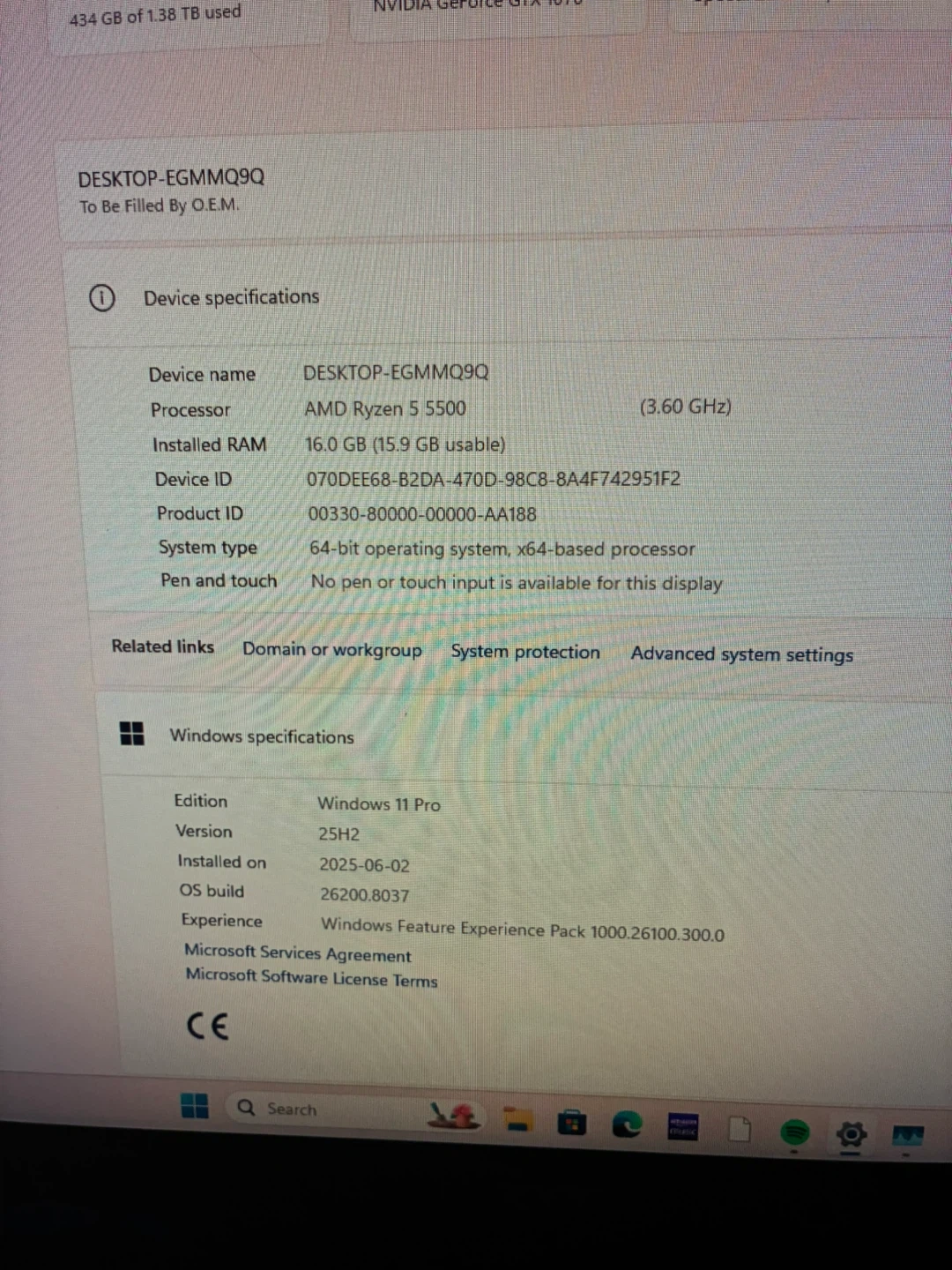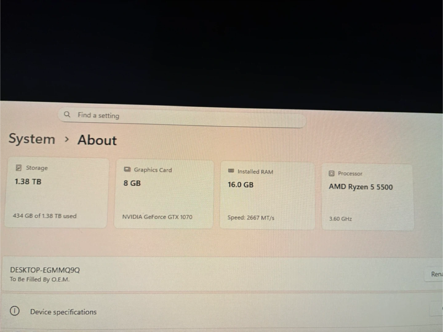 This custom gaming PC is built with an AMD Ryzen 5 5500 processor and 16GB of installed RAM. It features an NVIDIA GeForce GTX 1070 graphics card for gaming performance. The system comes with 1.38 TB of storage, running Windows 11 Pro.