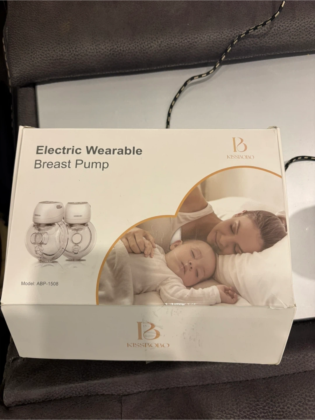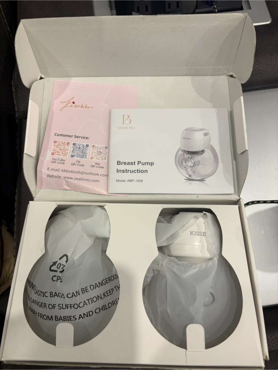 KISSBOBO double wearable electric breast pump. Includes the pump and instructions. Model ABP-1508. This is great for moms needing a discreet and portable pumping solution.