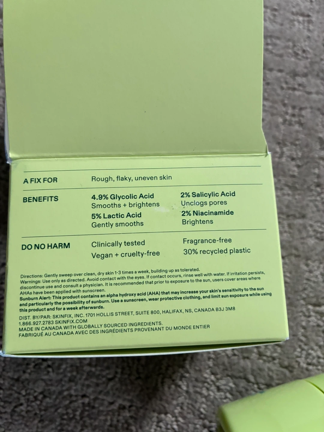 Skinfix resurface+ AHA/BHA Niacinamide Exfoliating Pads for smooth, bright skin. Contains 4.9% Glycolic Acid, 5% Lactic Acid, 2% Salicylic Acid, and 2% Niacinamide. Clinically tested and vegan. Made in Canada with globally sourced ingredients.