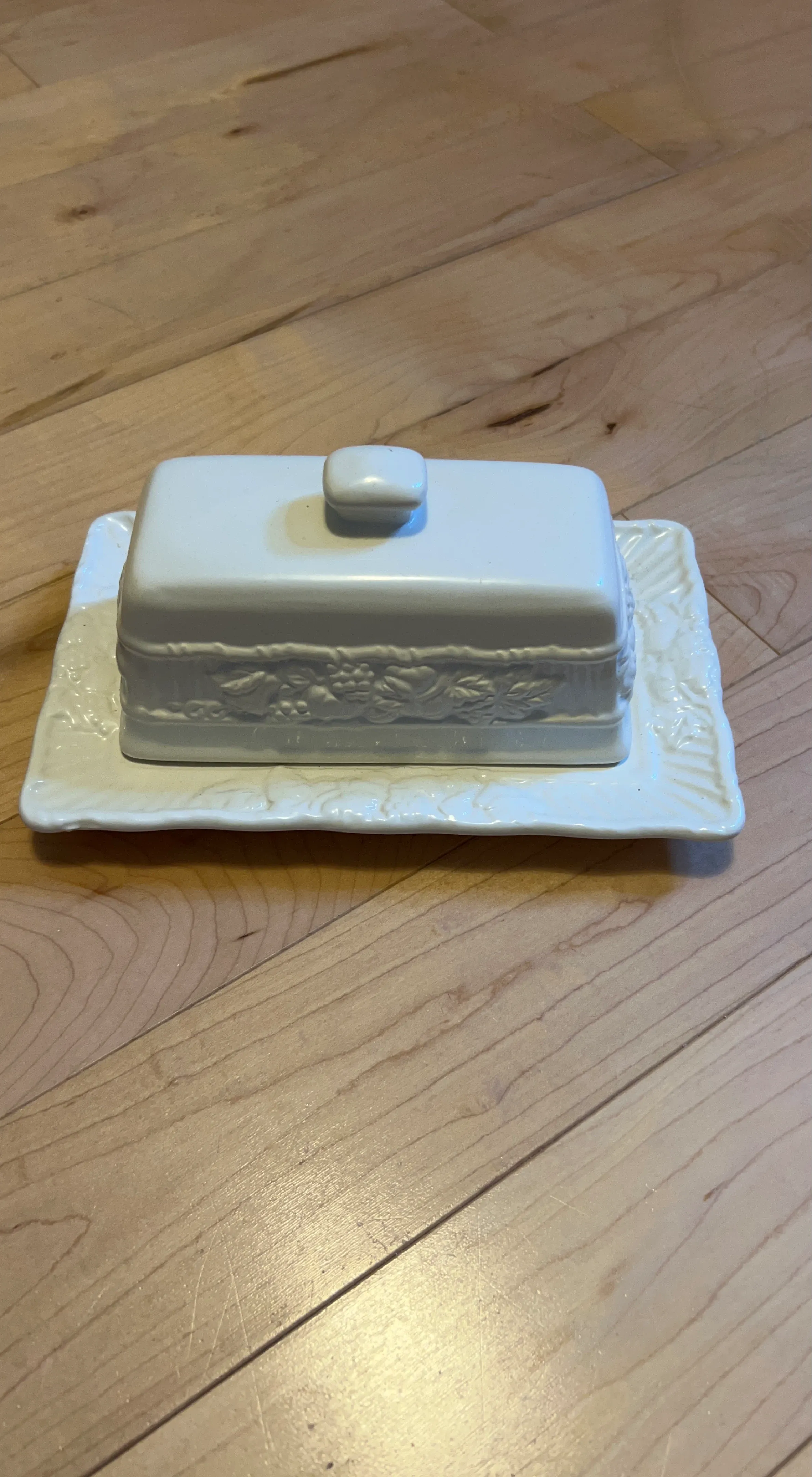 White ceramic butter dish with a decorative embossed floral pattern around the base. It has a matching lid with a small knob. Dishwasher safe.
