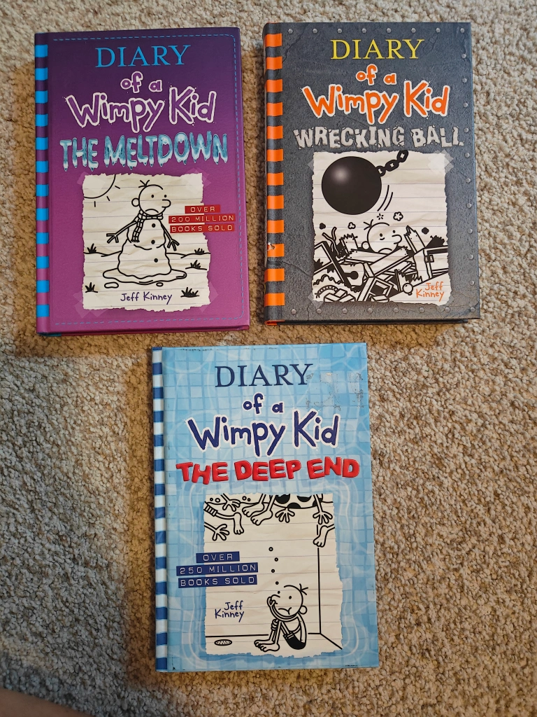 Our son is selling 3 Diary of a Wimpy Kid books: The Meltdown, Wrecking Ball, and The Deep End. All books are by Jeff Kinney. Great for young readers!