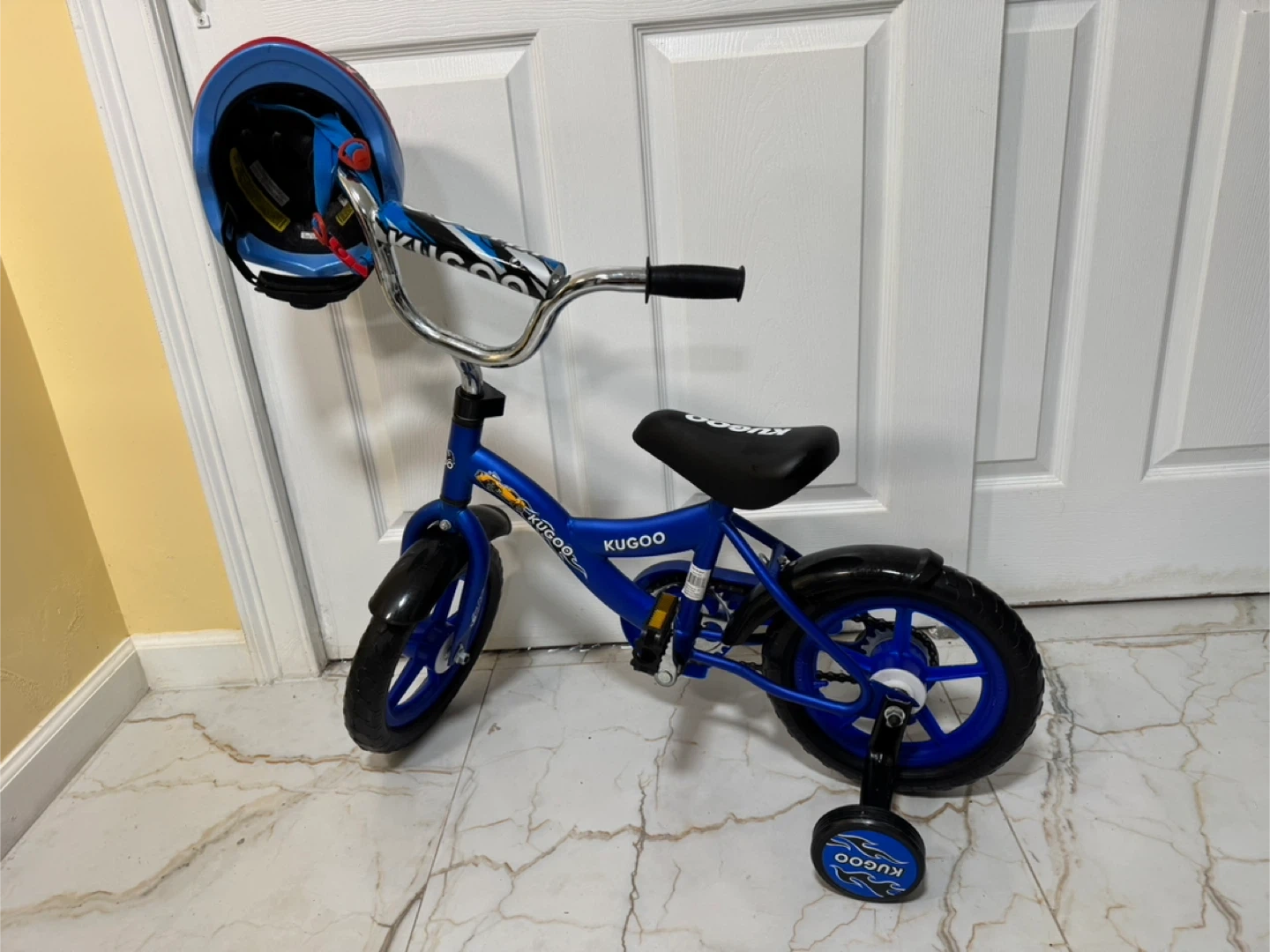 This is a KUGOO blue balance bike, perfect for young riders. It includes training wheels for added stability and a colorful dinosaur-themed helmet for safety. It's a great way to introduce children to cycling!