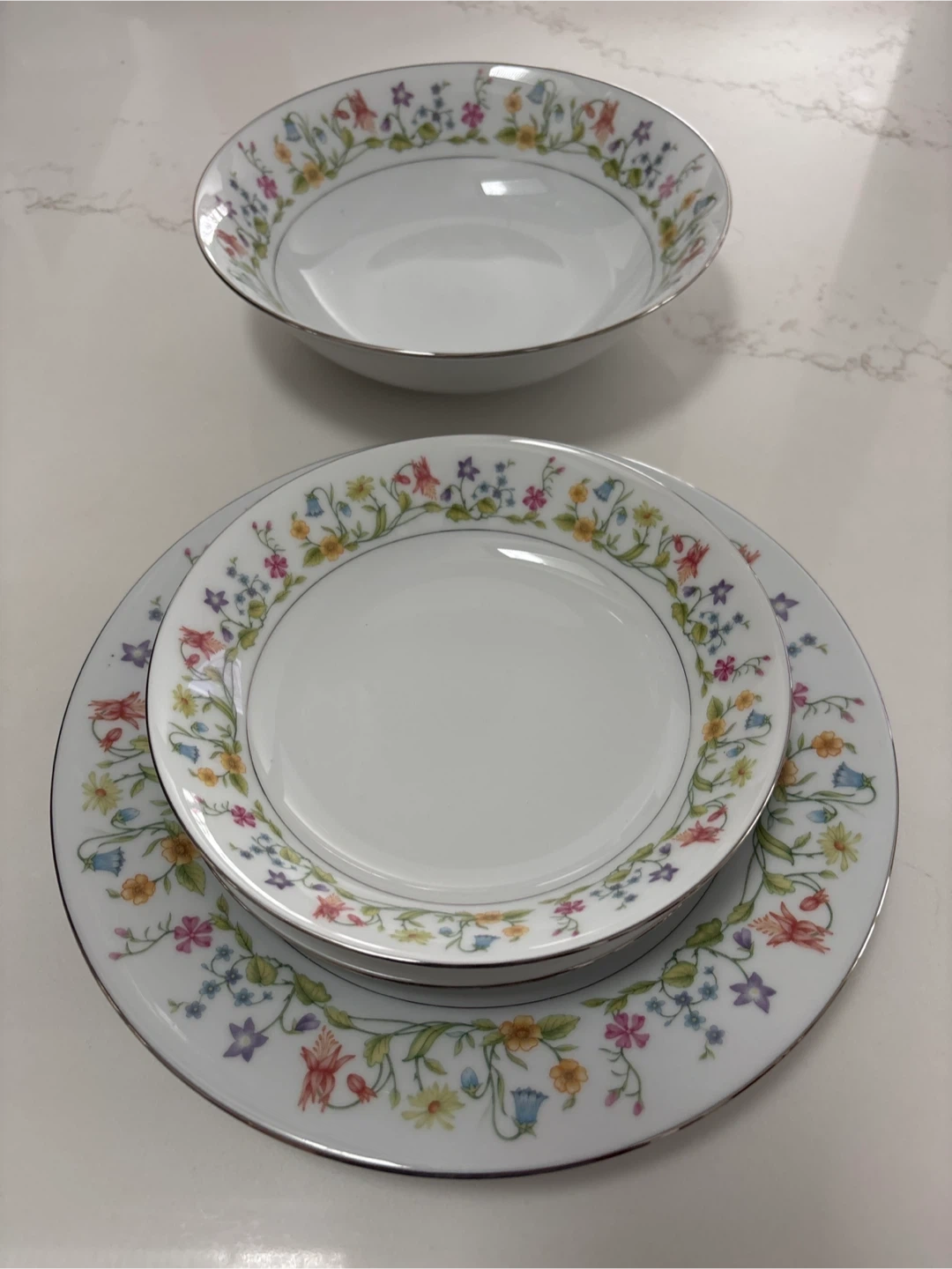 Selling a beautiful Crown Ming Fine China dinnerware set. The set of 8 including a serving bowl features a delicate floral pattern around the edges of the plates and bowls. Made in China by Jian Xiang, this set is perfect for adding a touch of elegance to any meal.