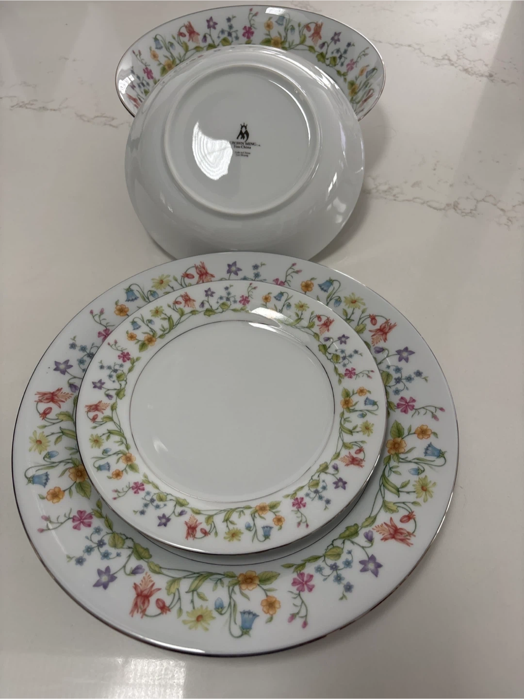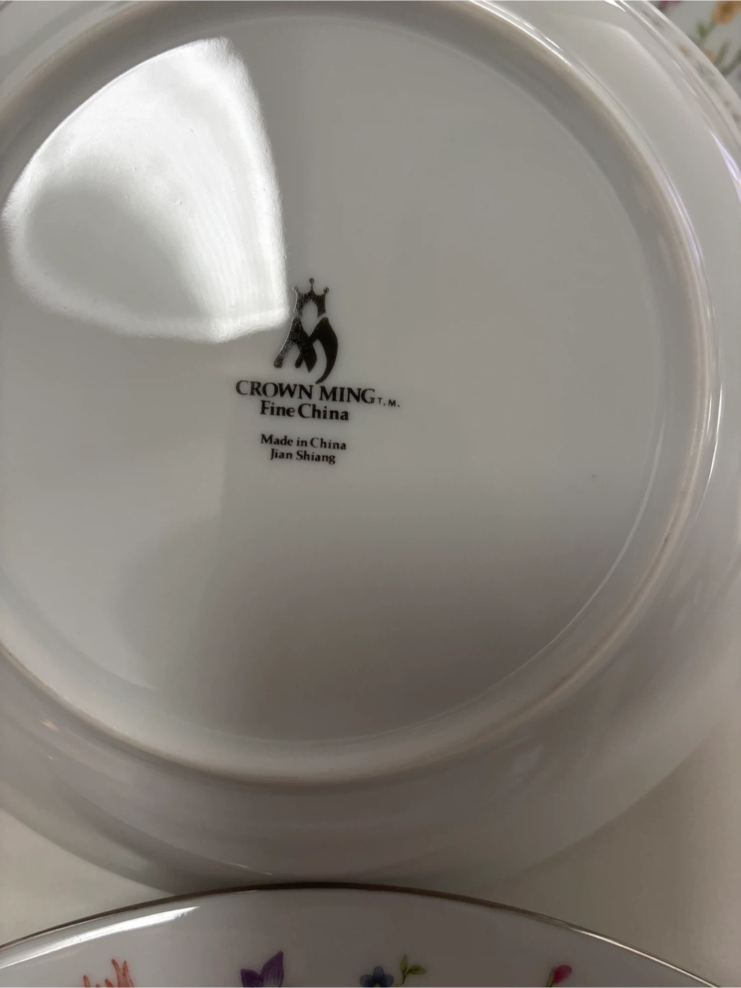 Selling a beautiful Crown Ming Fine China dinnerware set. The set of 8 including a serving bowl features a delicate floral pattern around the edges of the plates and bowls. Made in China by Jian Xiang, this set is perfect for adding a touch of elegance to any meal.
