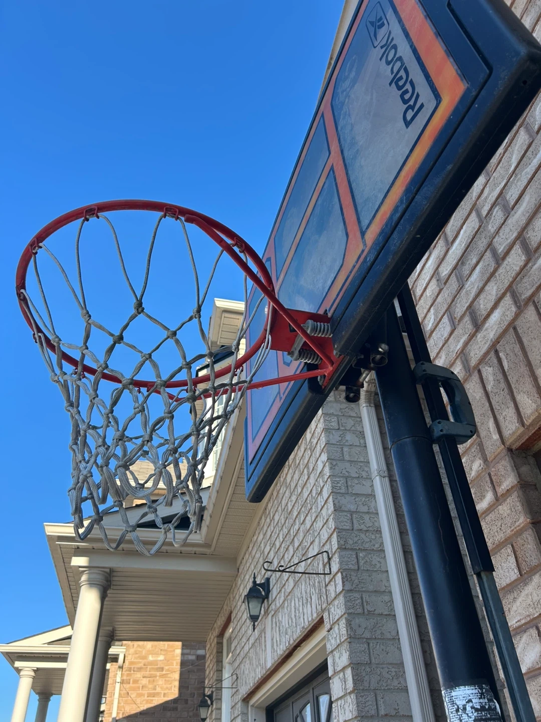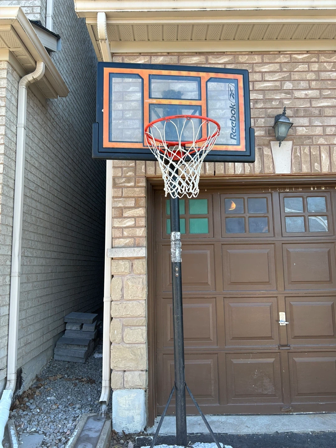 Portable basketball hoop with a Reebok branded backboard and net. It has a sturdy pole and a weighted base that can be filled with water or sand. This is great for driveway hoops or backyard fun!