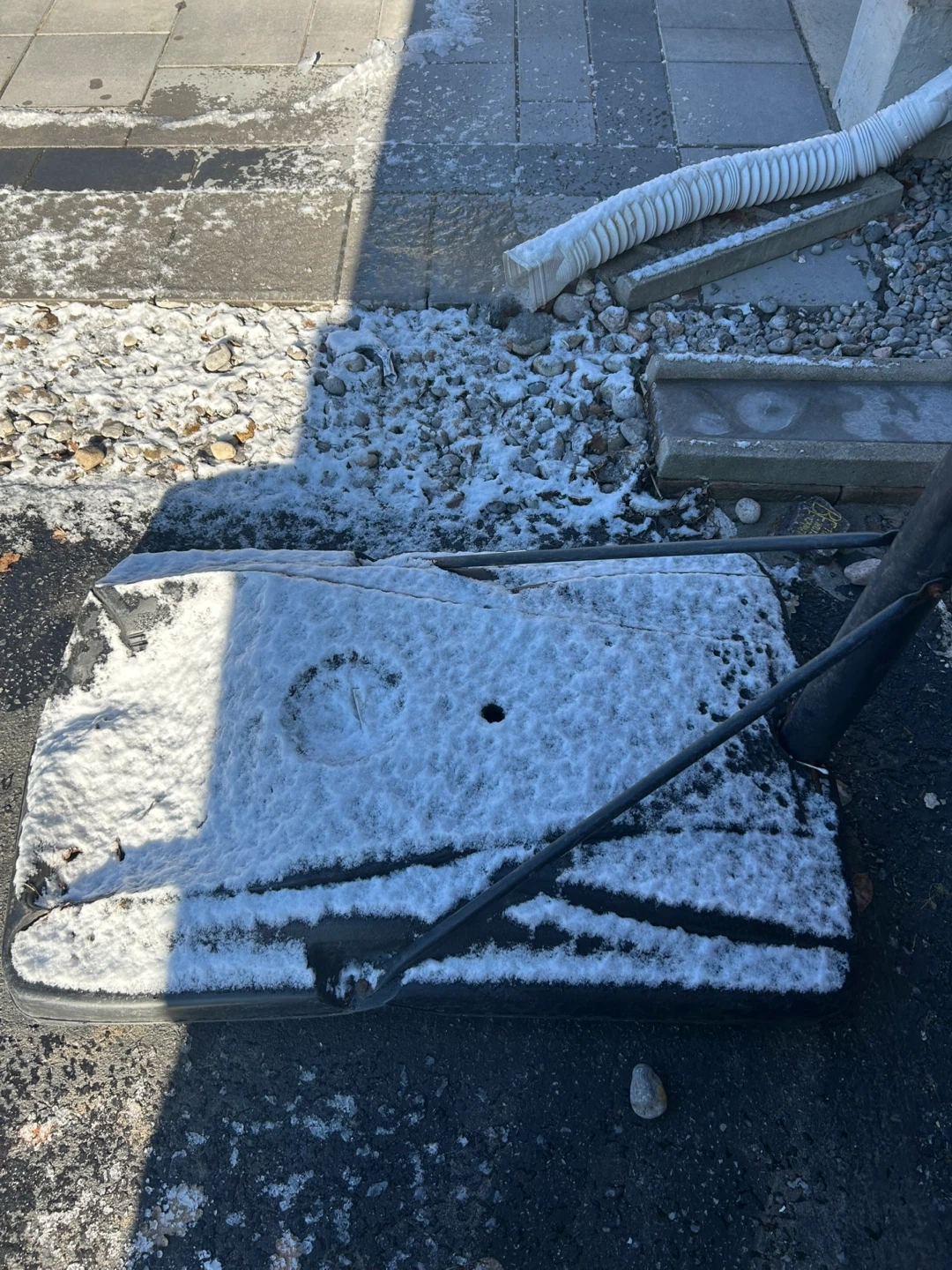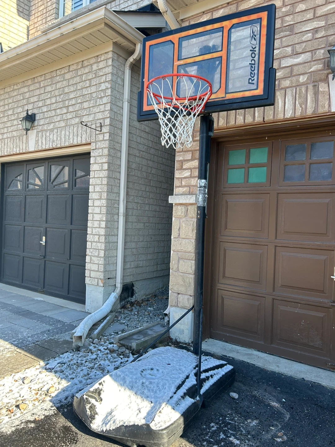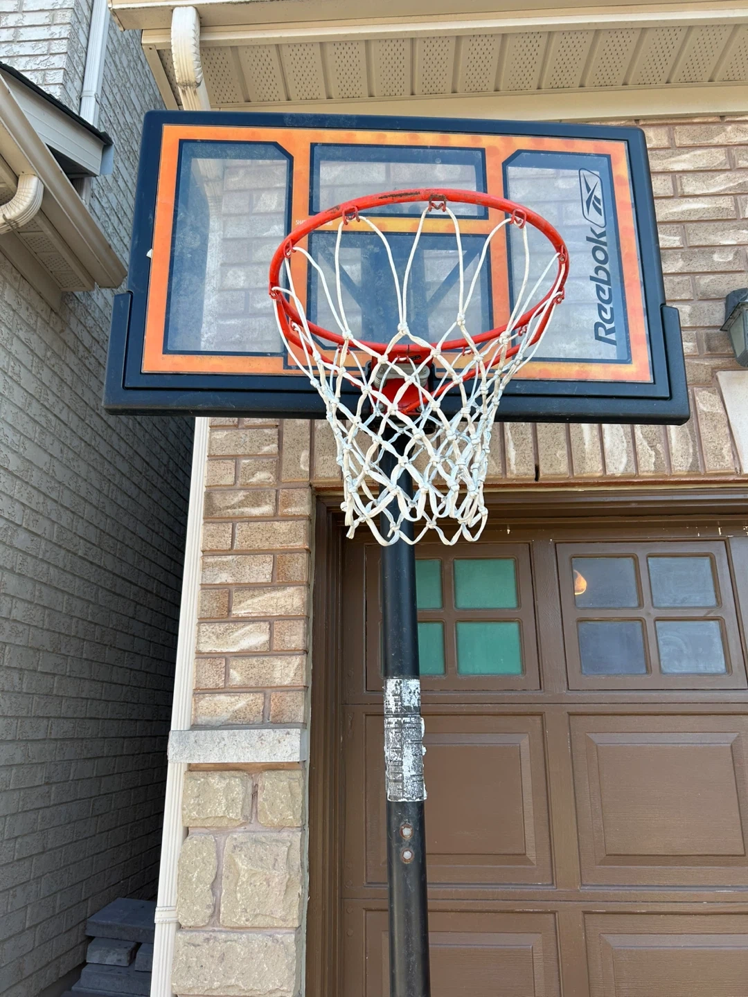 Portable basketball hoop with a Reebok branded backboard and net. It has a sturdy pole and a weighted base that can be filled with water or sand. This is great for driveway hoops or backyard fun!