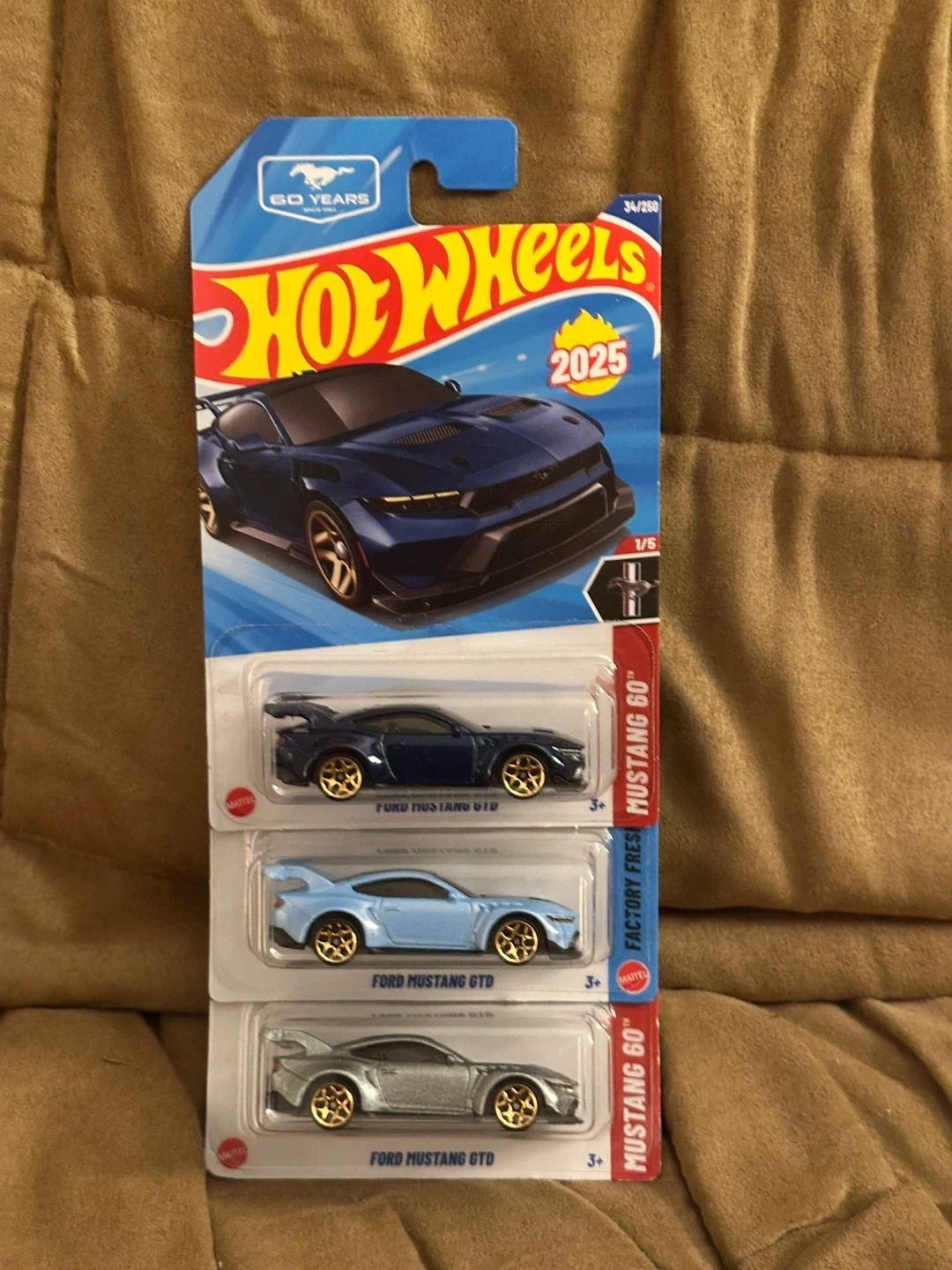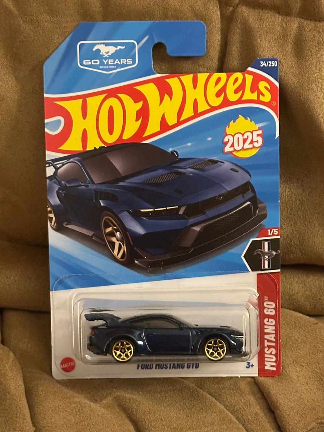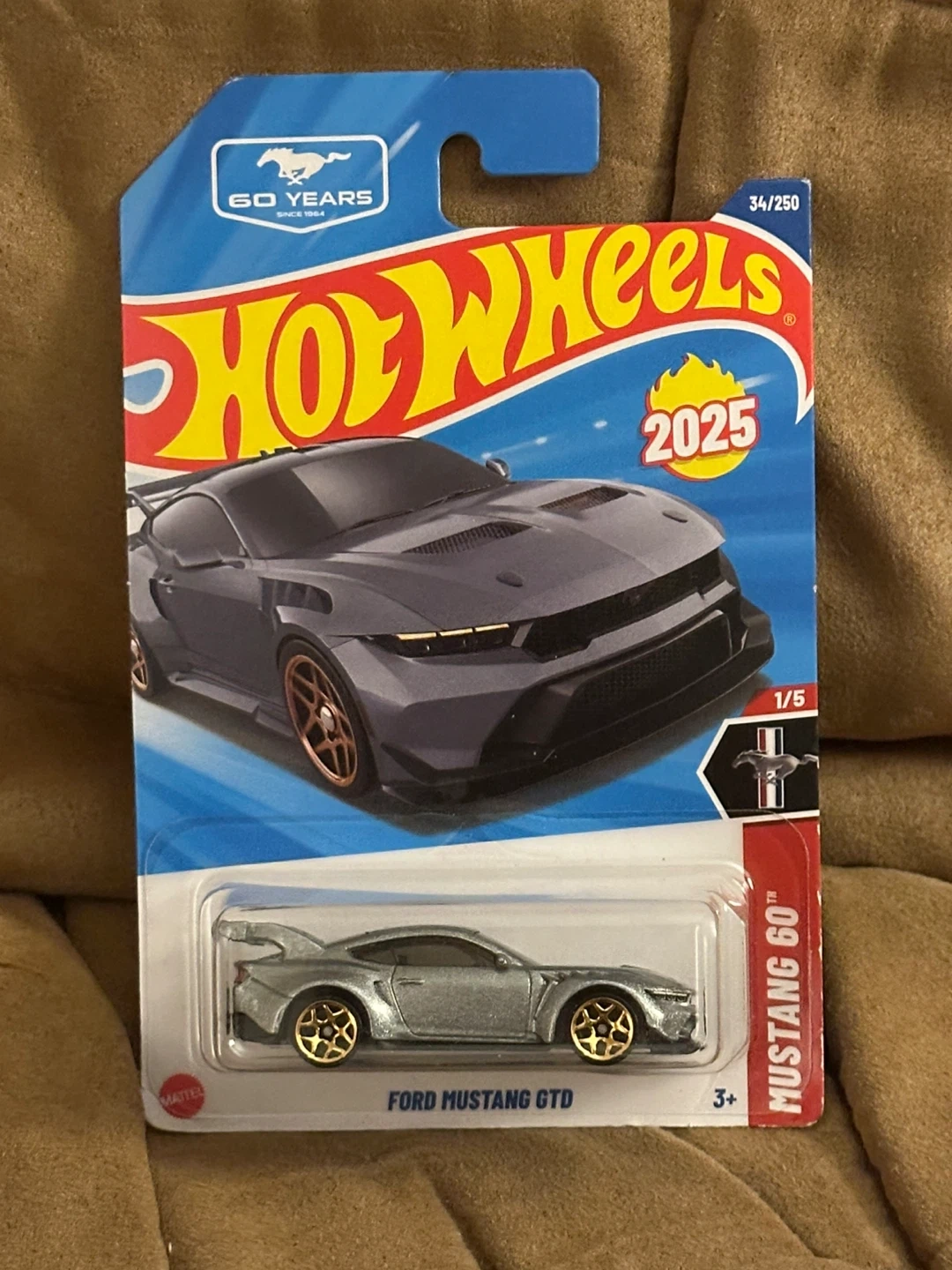 This is a Hot Wheels 2025 Ford Mustang GTD die-cast toy car. It's part of the 60 Years series. The car is a 1:64 scale model. Suitable for ages 3 and up.