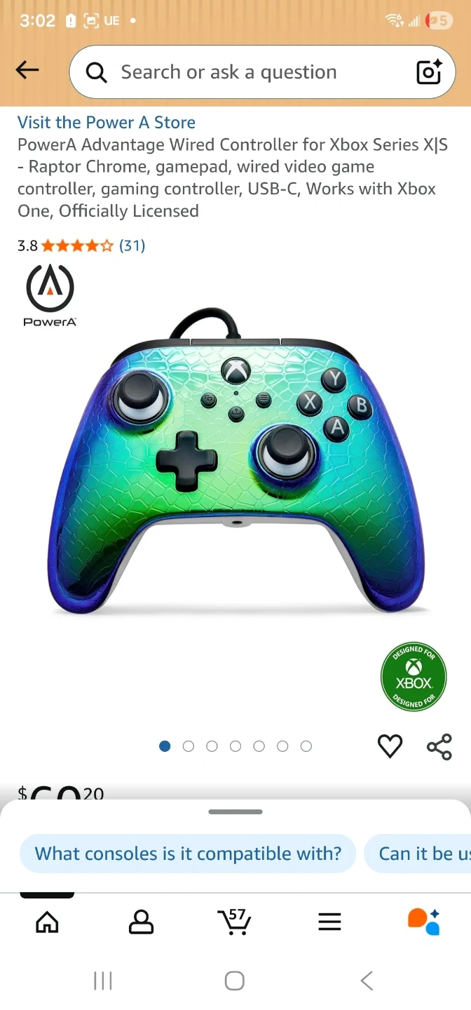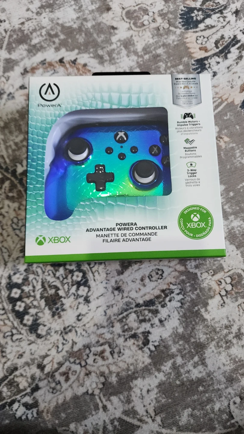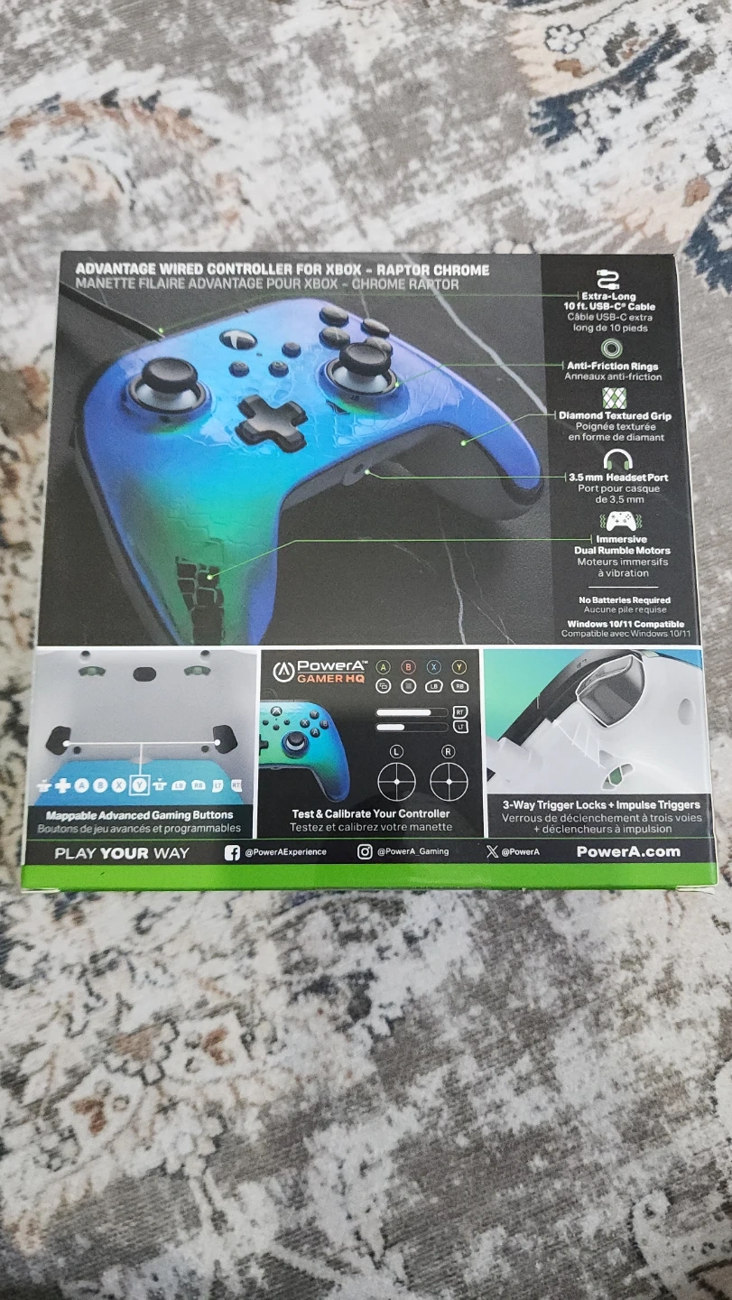 This is the PowerA Advantage Wired Controller for Xbox Series X|S in a Raptor Chrome finish. It features a 10 ft. USB-C cable and Mappable Advanced Gaming Buttons. It also includes Dual Rumble Motors for immersive gameplay.