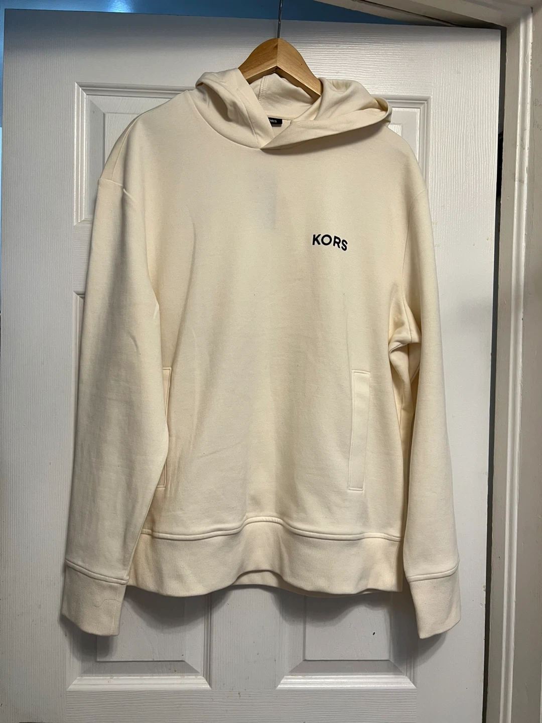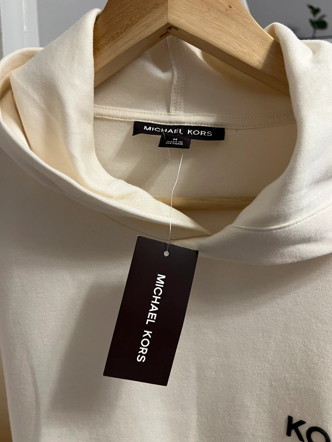 It's a brand new Michael Kors cream-coloured hoodie. Its unisex. Medium for men or Large for women. Retail price is $175, shown on the tag. Selling it for $100.