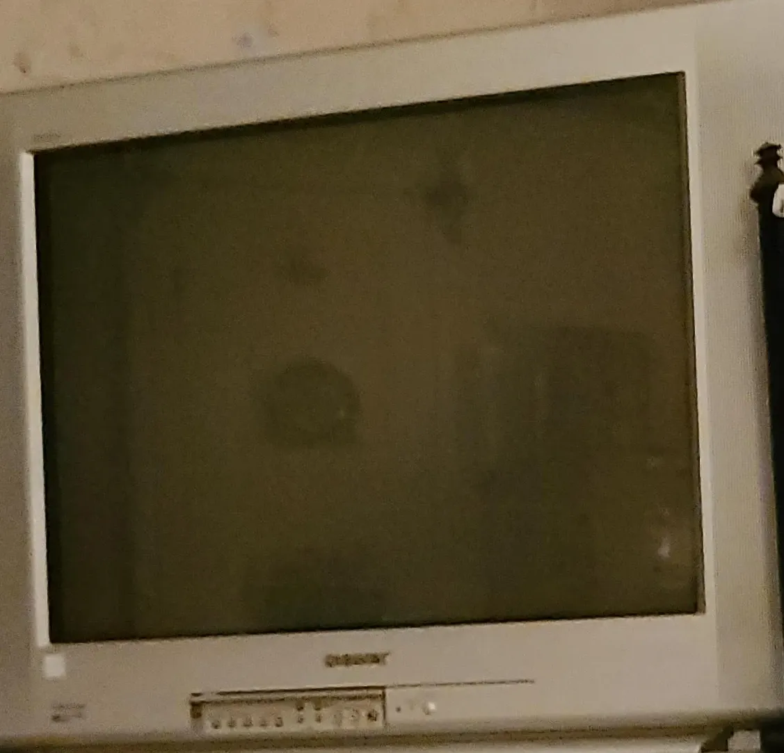 A classic Sony CRT television. It's a silver unit with front controls. This TV is great for retro gaming setups! 27 un screen