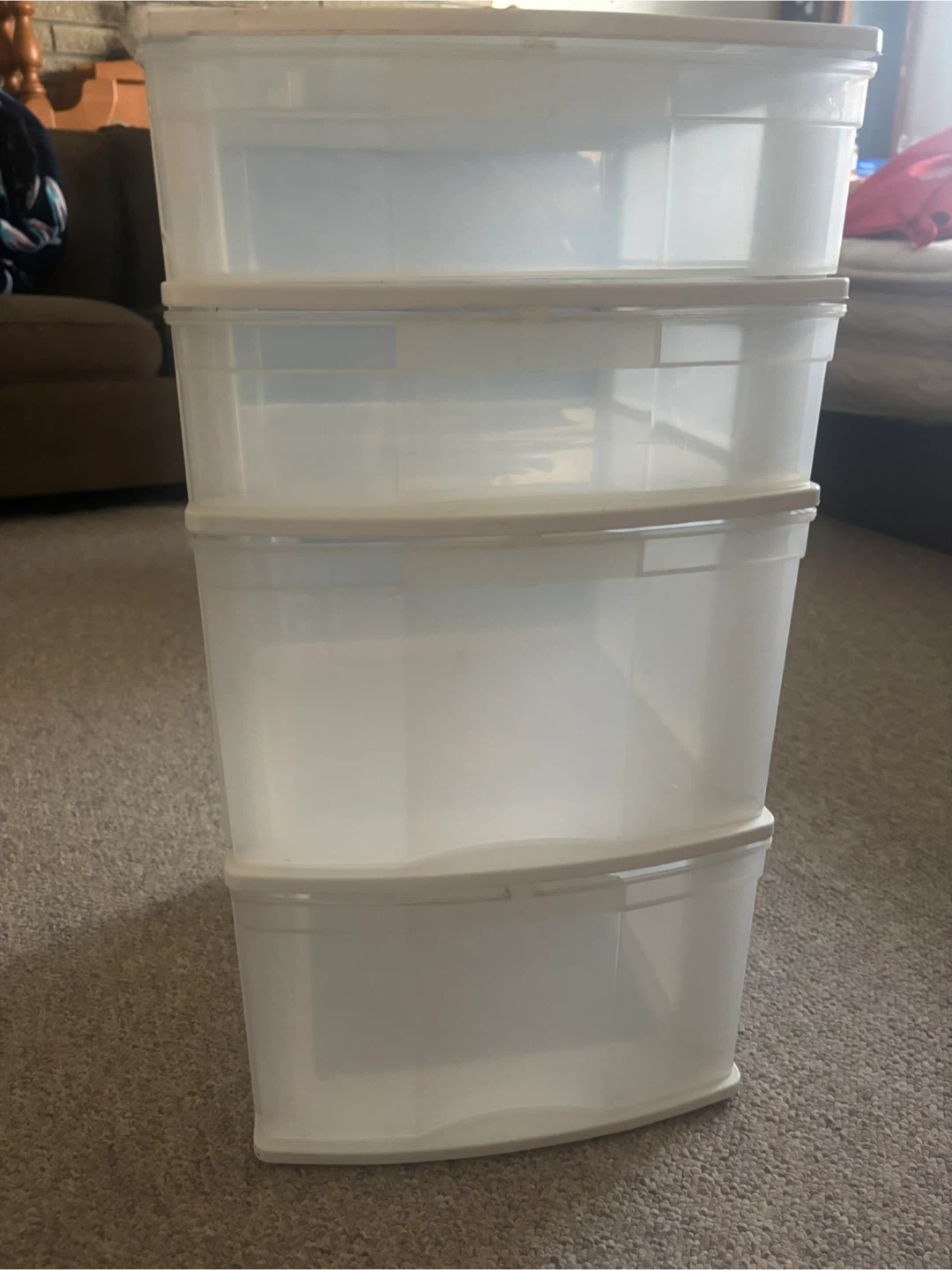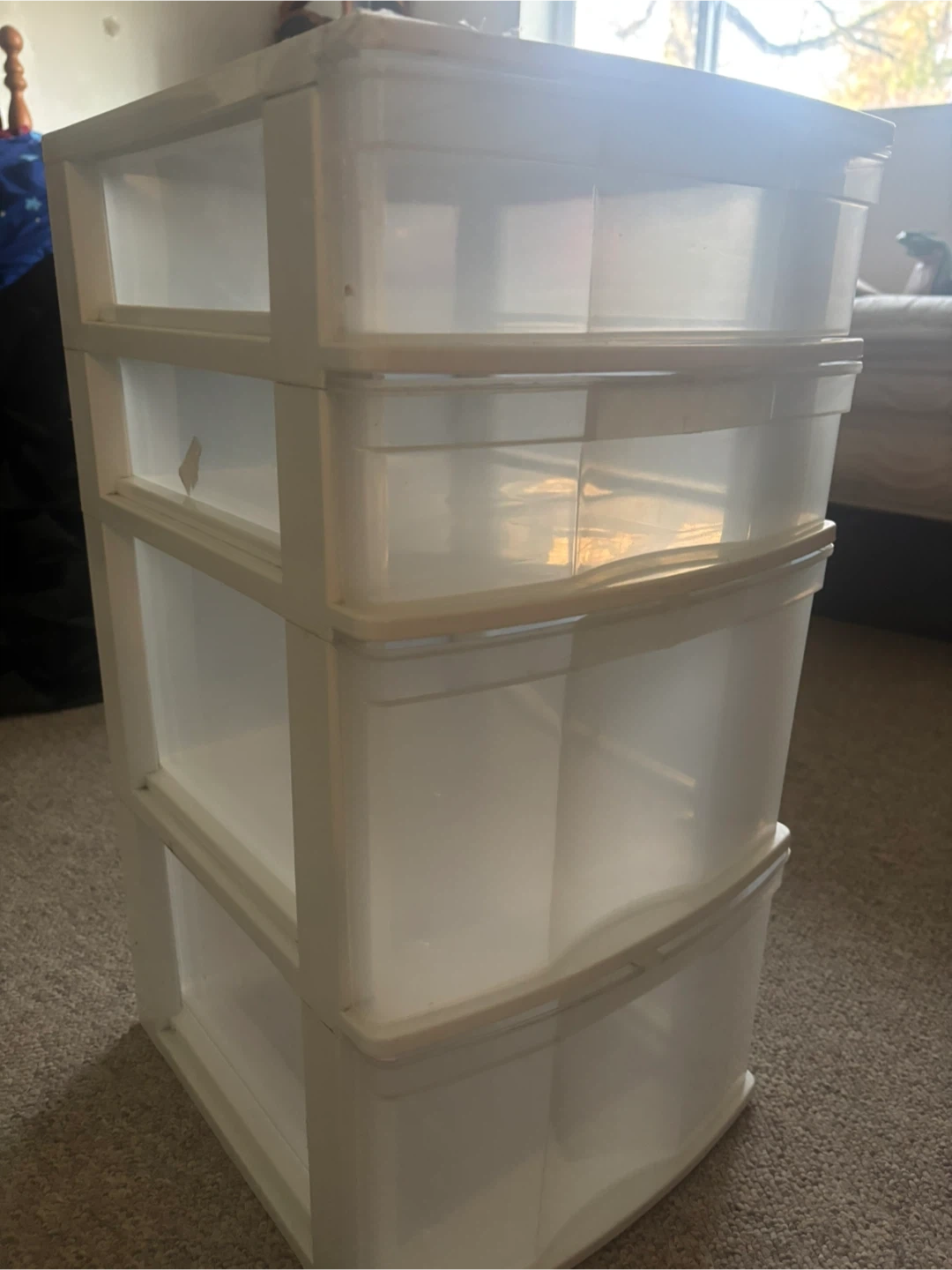 Selling a handy 4-drawer plastic storage tower! It's perfect for organizing your space and keeping things tidy. Great for storing clothes, toys, or office supplies. The drawers slide out smoothly, making it easy to access your items