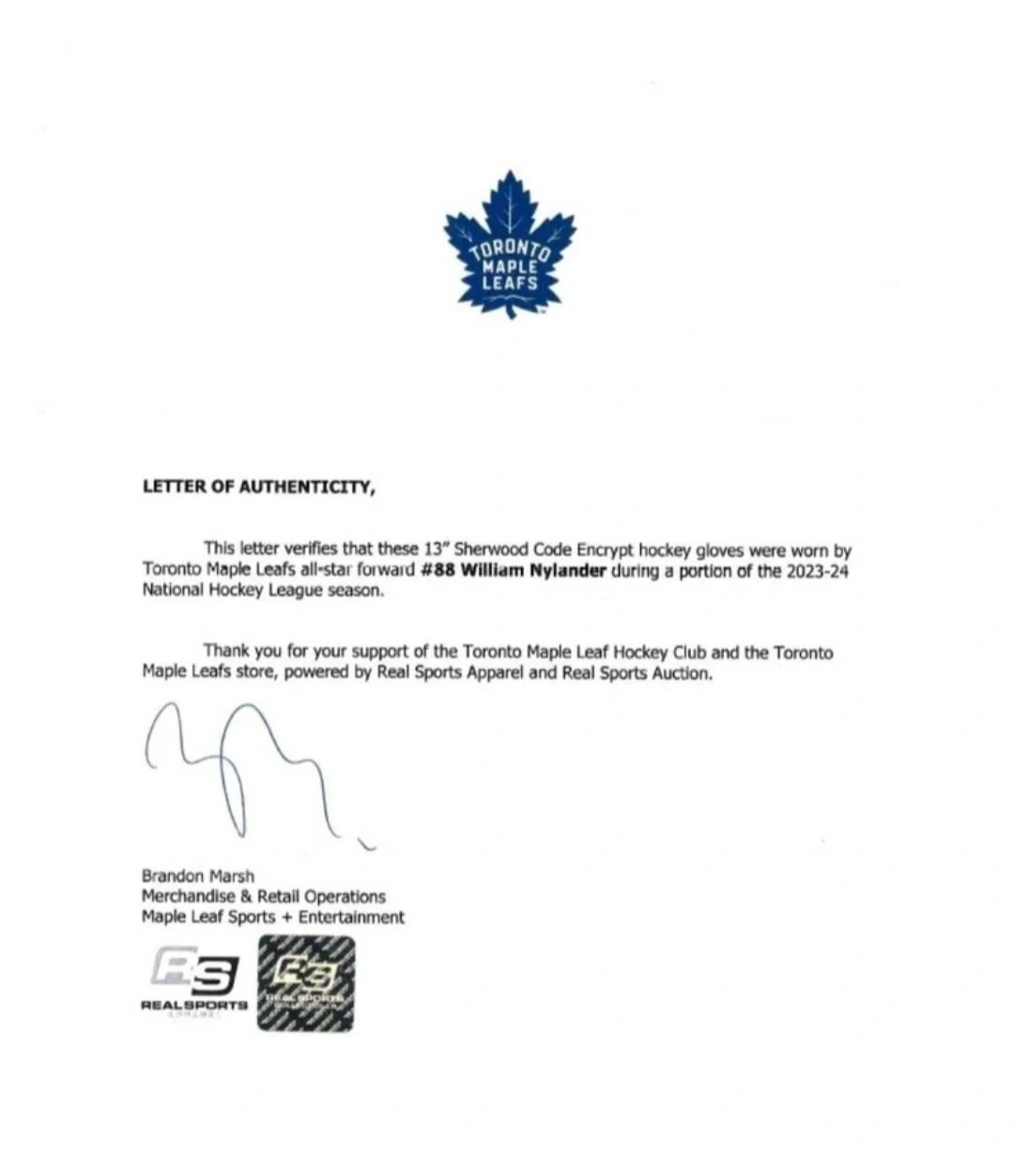 These are 13" Sherwood "Code Encrypt" hockey gloves. They were worn by Toronto Maple Leafs all-star forward #88 William Nylander during a portion of the 2023-24 National Hockey League season. Comes with a letter of authenticity from Real Sports Apparel and Real Sports Auction.