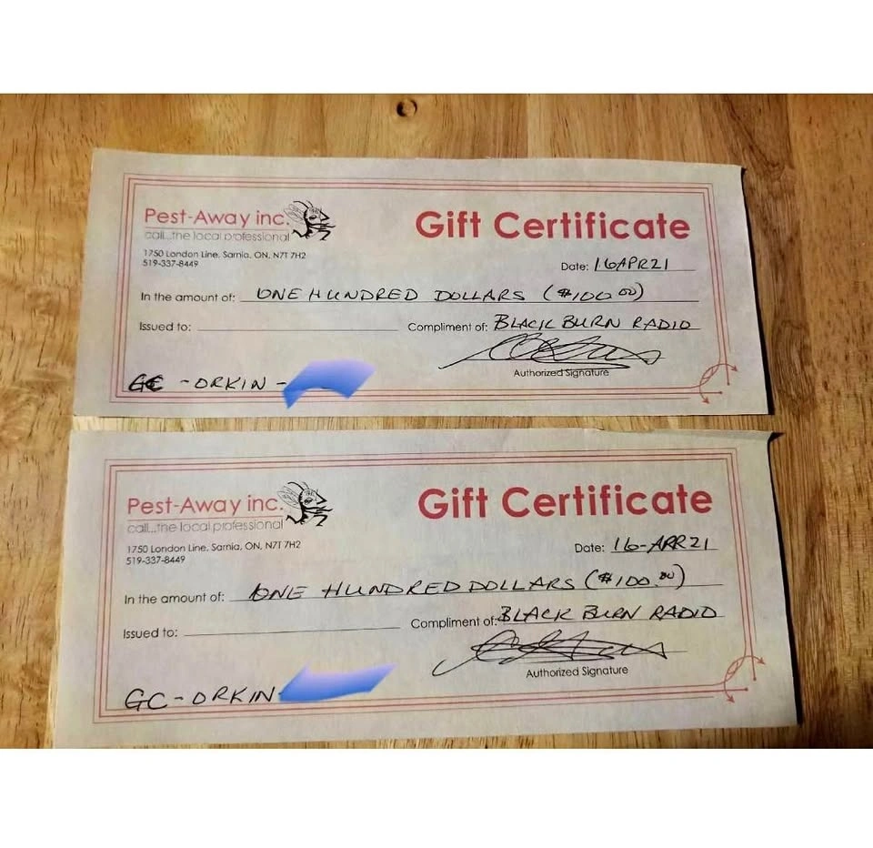 TWO Pest-Away $100 gift certificates, unused. (Totals $200) Asking $150 for both. I blocked out the full numbers on the photo. You are welcome to call in to Pest Away during pick up to check that the gift cards are valid still. Price is firm. Pick up in Sarnia.