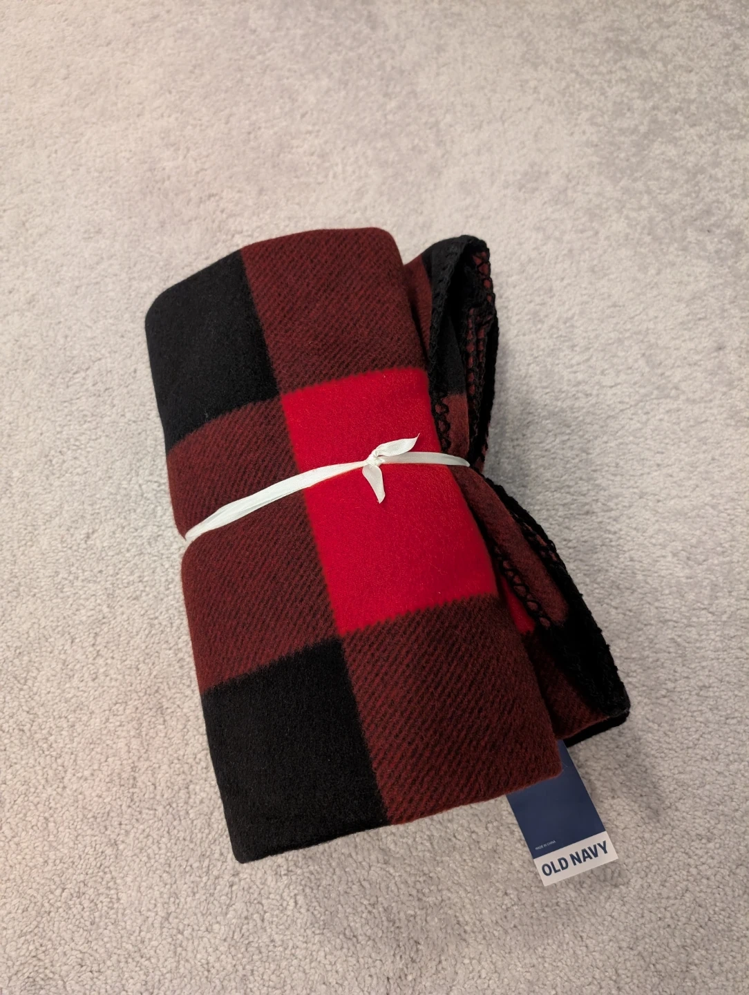 Old Navy blanket in a classic red and black plaid pattern. It's made for comfort and warmth. Dimensions are 50" wide x 56" long.