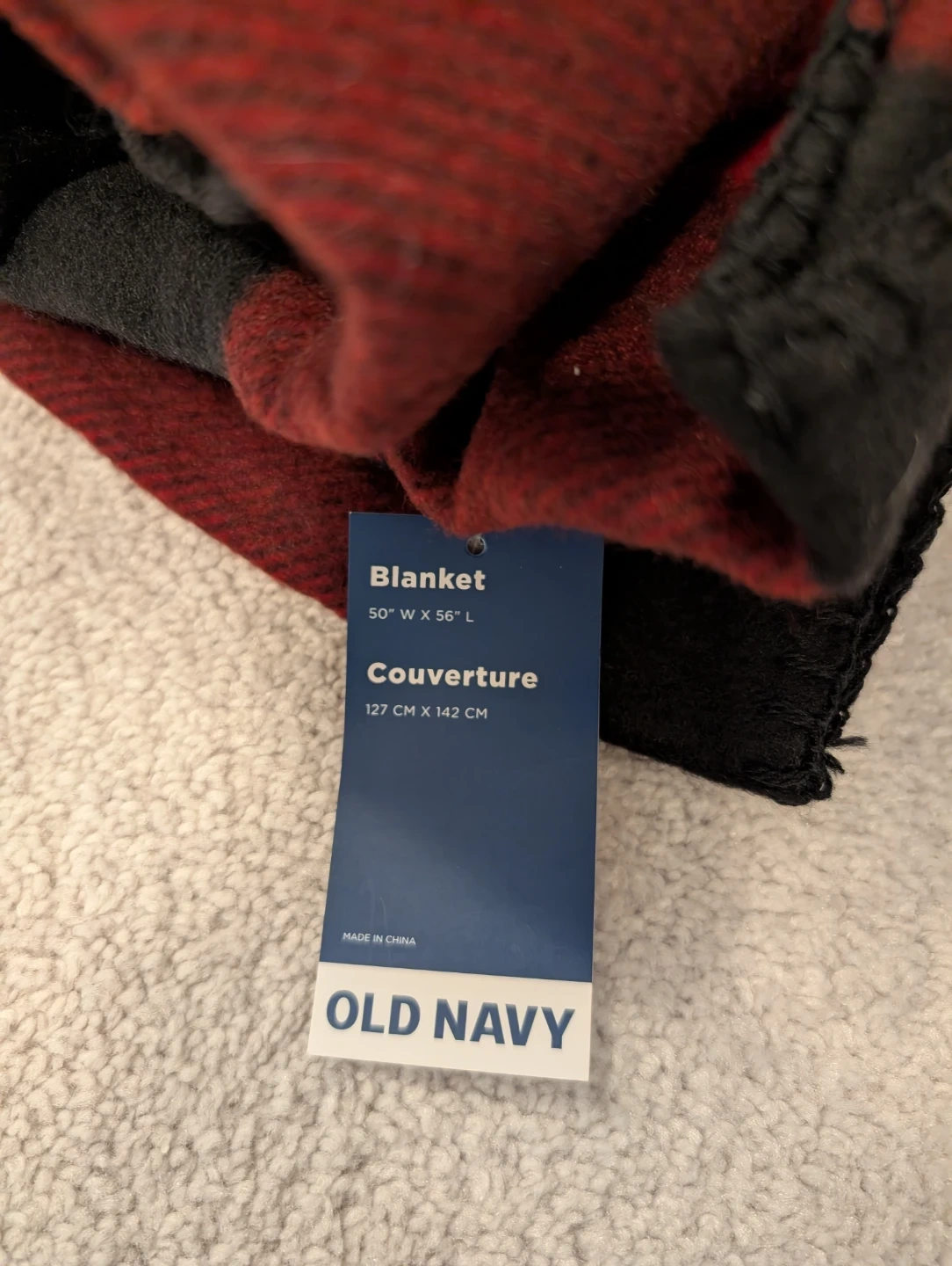 Old Navy blanket in a classic red and black plaid pattern. It's made for comfort and warmth. Dimensions are 50" wide x 56" long.