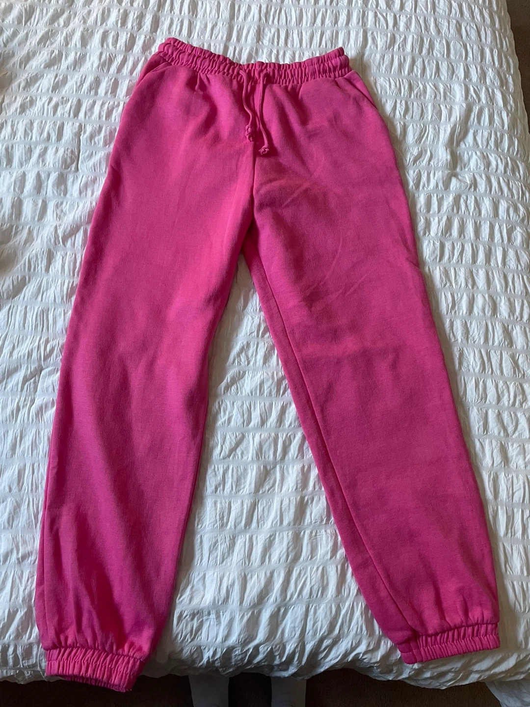 These vibrant pink sweatpants from ZARA are a size medium. They're made from a soft fleece material with an elastic waistband and drawstring for a comfortable fit. Perfect for lounging at home or casual outings!