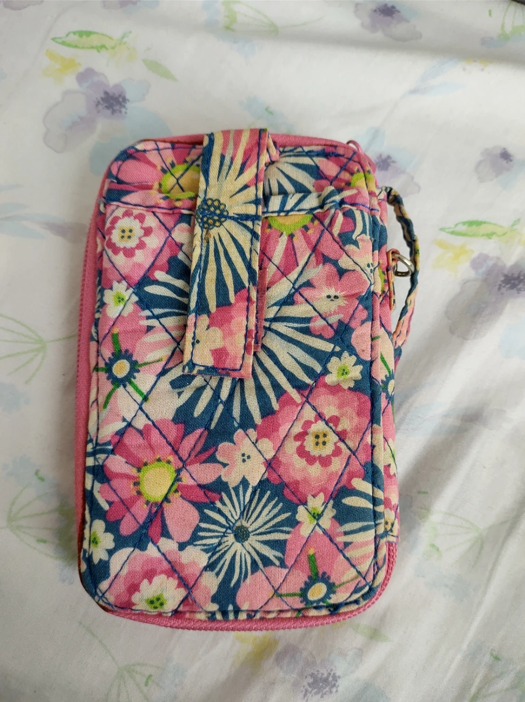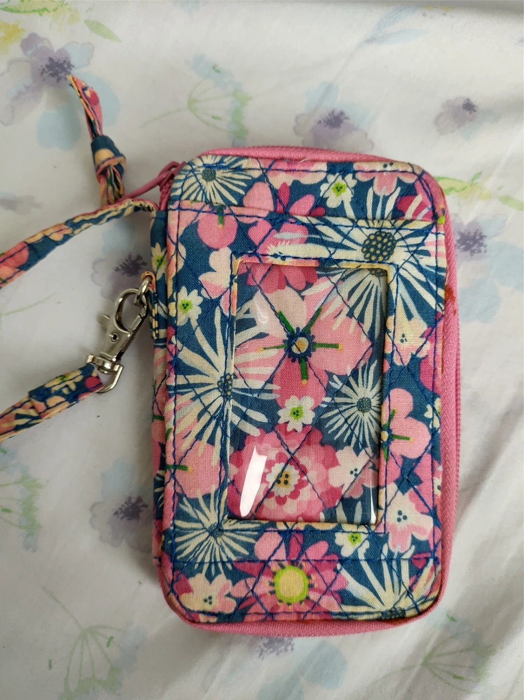 This quilted wallet features a vibrant floral pattern and a convenient ID window. It has multiple card slots inside and a zip-around closure for security. It's perfect for keeping your essentials organized on the go!