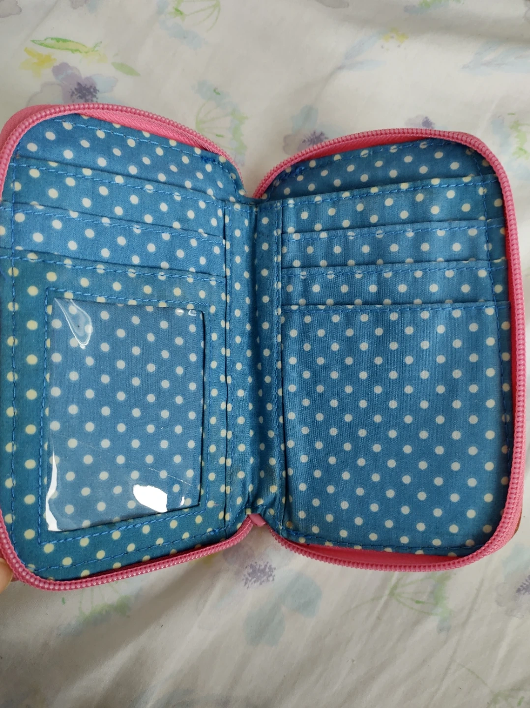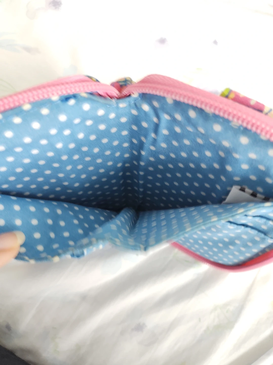 This quilted wallet features a vibrant floral pattern and a convenient ID window. It has multiple card slots inside and a zip-around closure for security. It's perfect for keeping your essentials organized on the go!