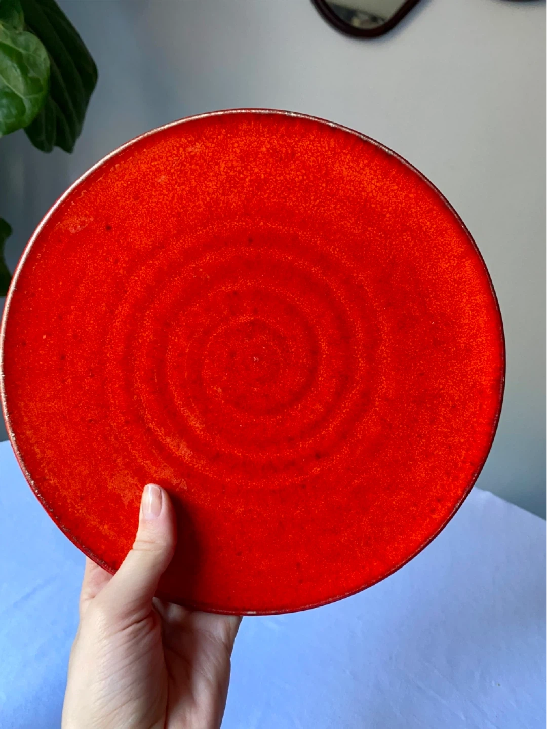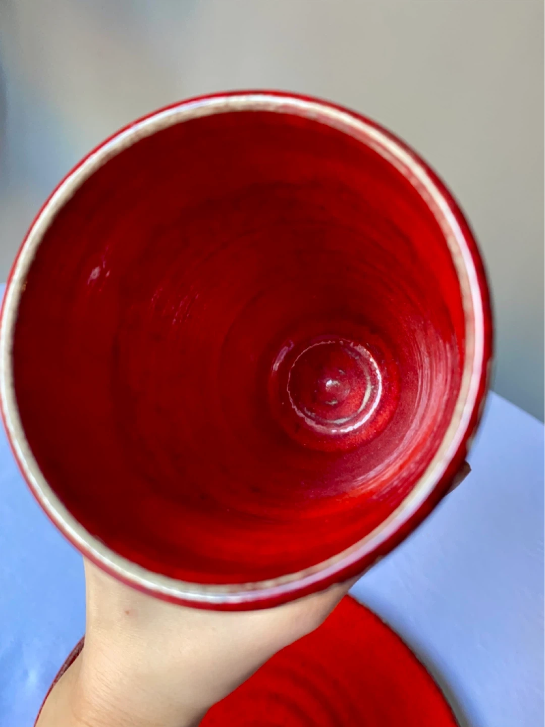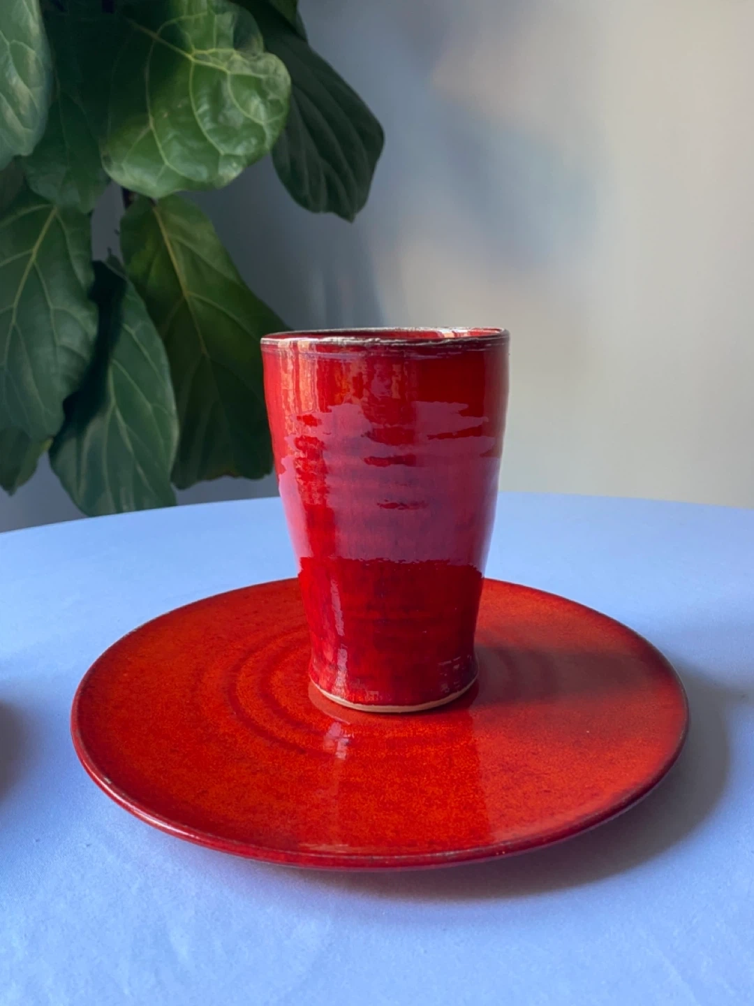 Fire engine red, obsidian, and toasted almond. Heavyweight glazed stoneware.
