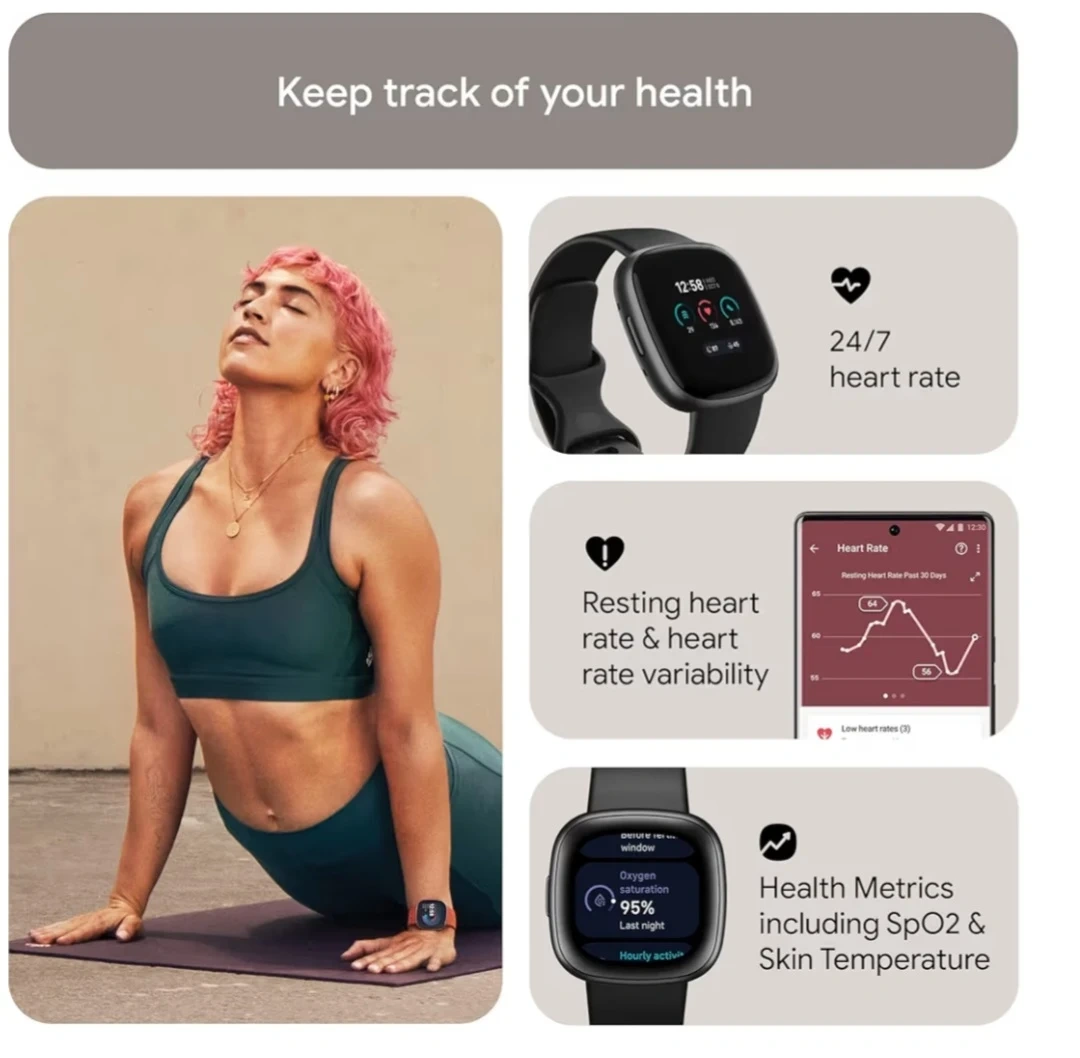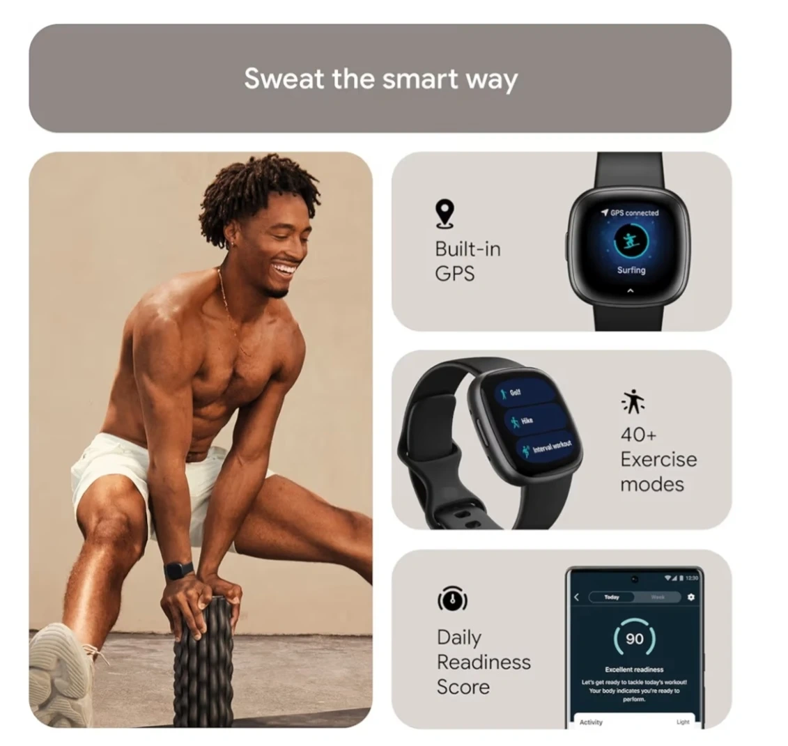 Selling a Fitbit Versa 4 fitness smartwatch tracks your daily readiness, GPS, and heart rate. It comes with 40+ exercise modes, sleep tracking, and is compatible with iOS and Android. Battery life lasts over 6 days with fast charge and includes a charger.