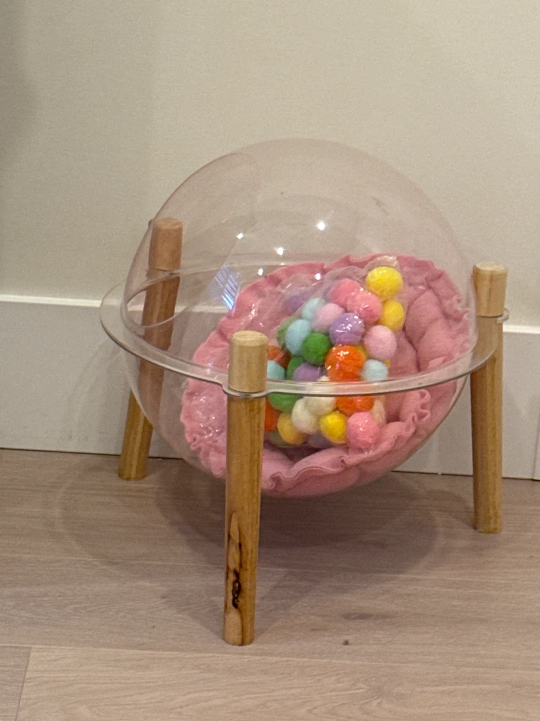 This is a unique pet bed featuring a clear dome enclosure and a soft pink cushion. It's supported by natural wood legs, offering a cozy spot for your pet. Includes a bag of colourful pom-poms for added fun!