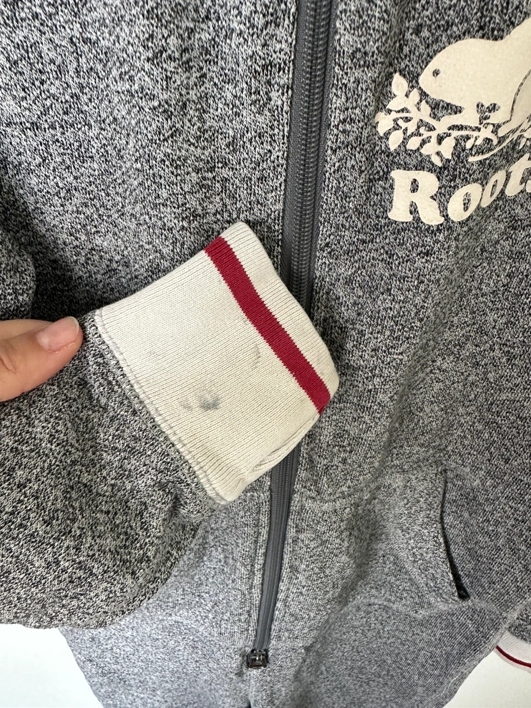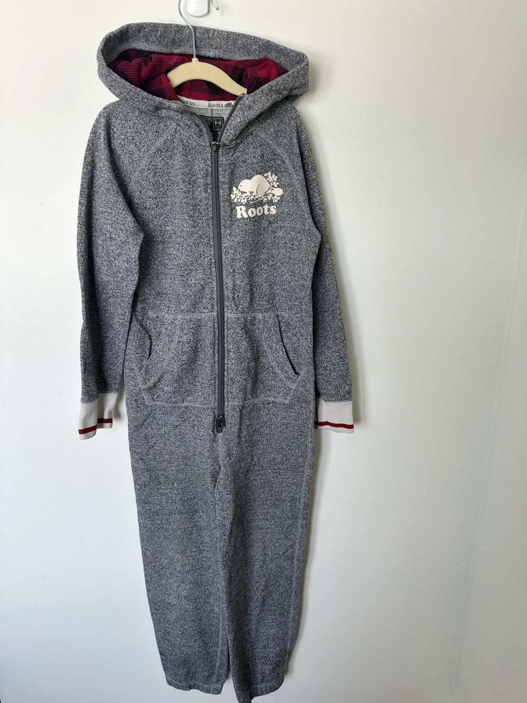 Roots Kids one-piece pajamas in grey. It's a size S/P, suitable for 5-6 years or 130/68. Features the iconic Roots logo on the chest. Cozy for lounging! Small untreated mark on cuff