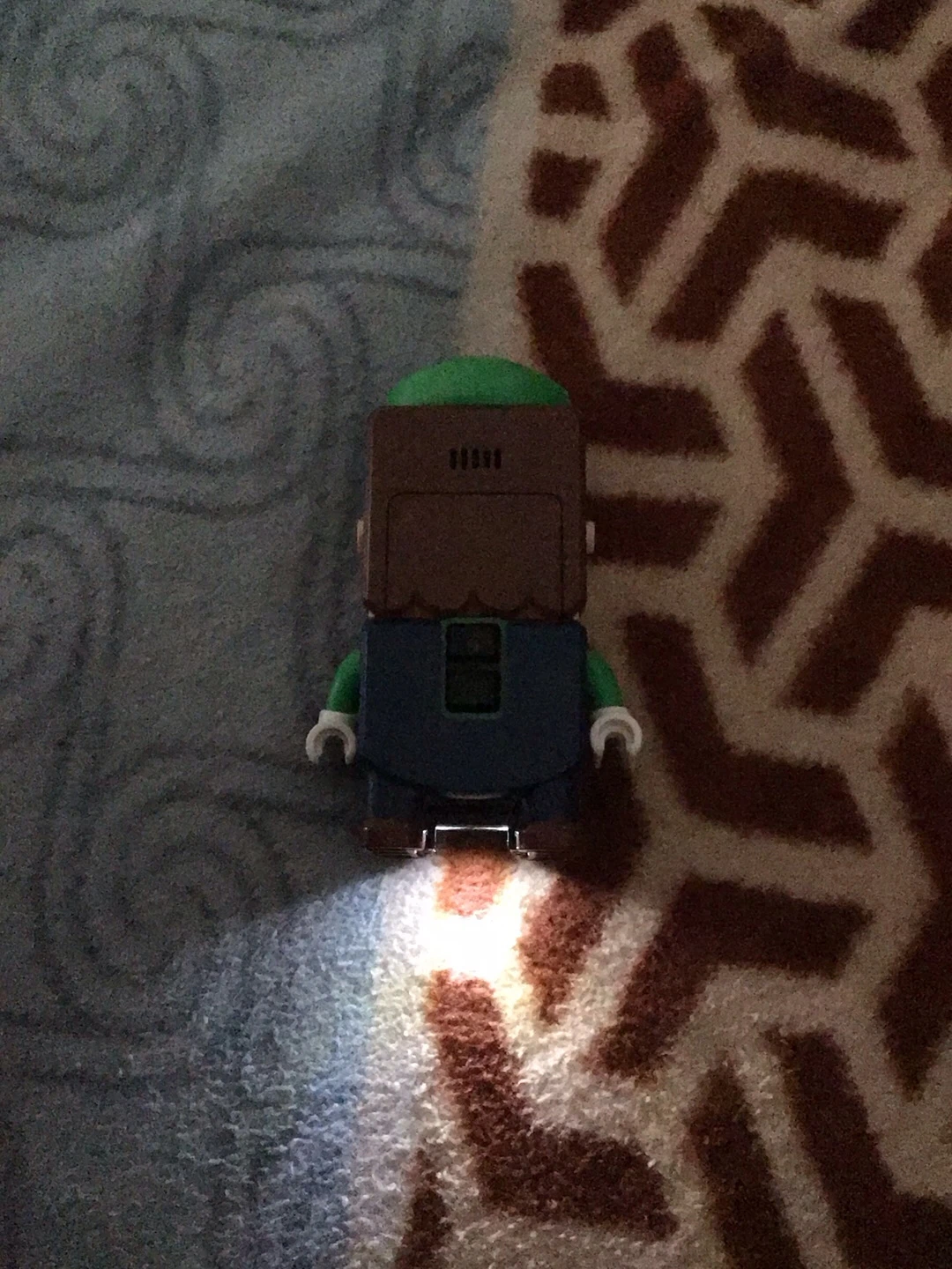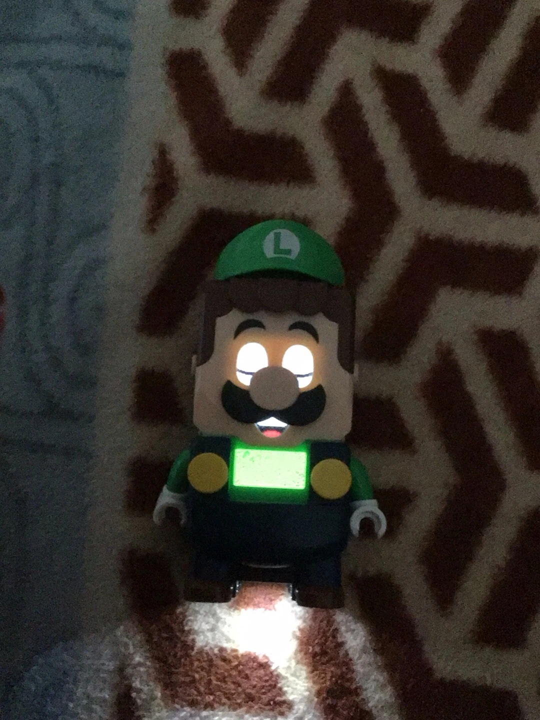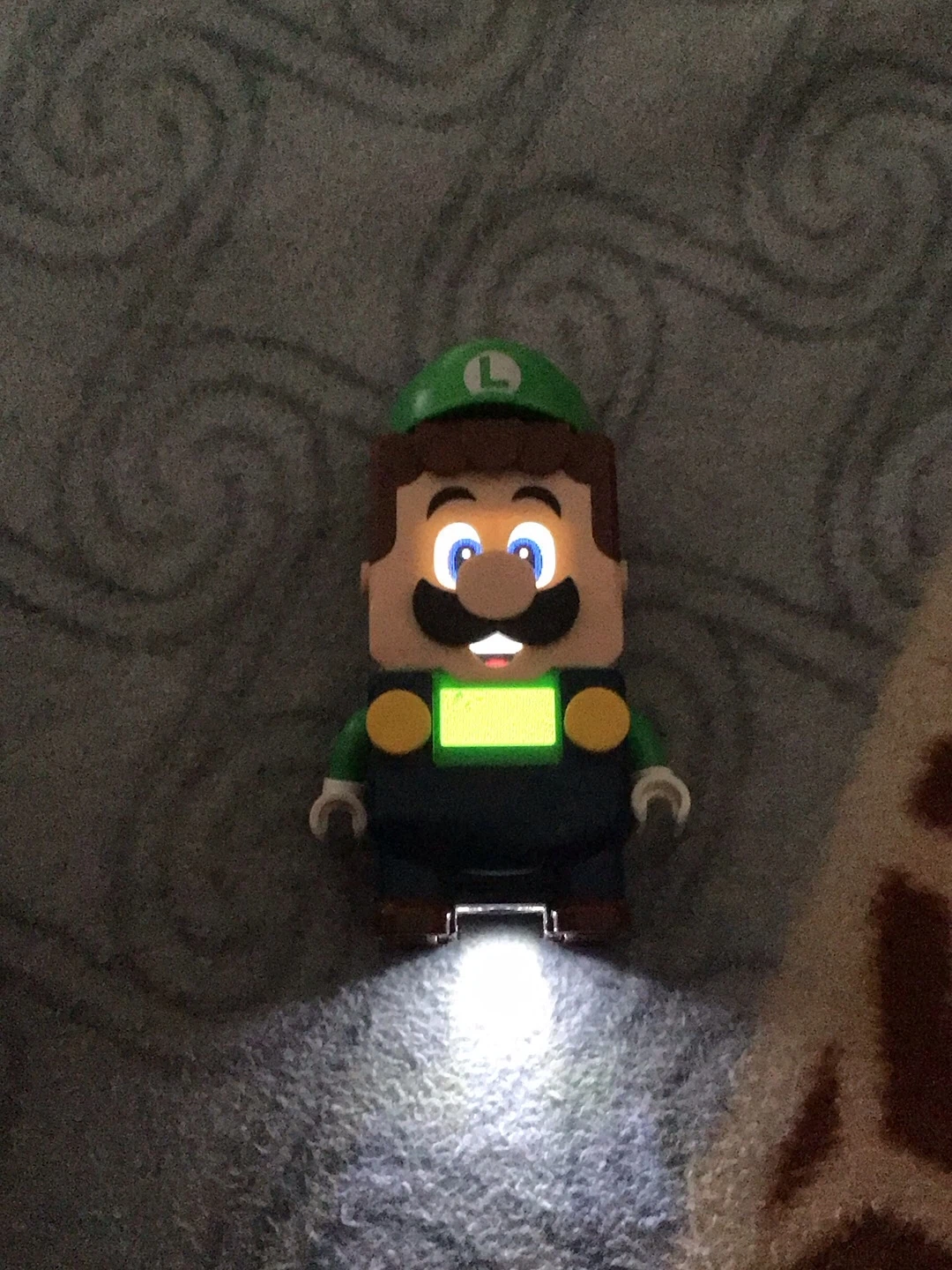 This is a LEGO Super Mario Luigi mini-figure with a built-in LED light camera for colours. The figure is made of durable plastic.