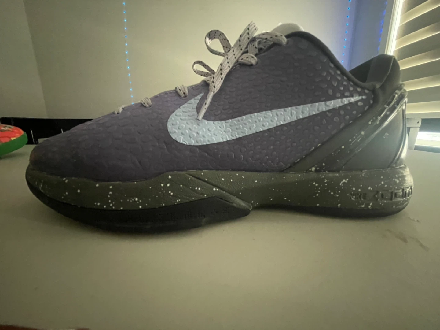 These Nike EYBL Kobe 6 Protro basketball shoes are designed for performance on the court. They feature a textured upper in a purple hue with a light blue Nike Swoosh. The speckled midsole adds a unique touch. Includes original laces. NO BOX