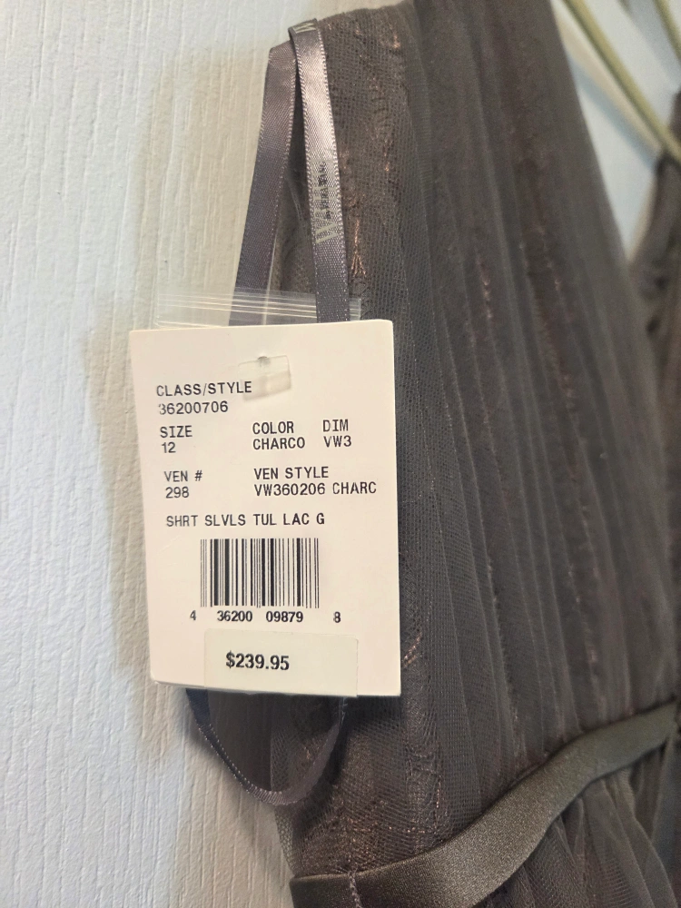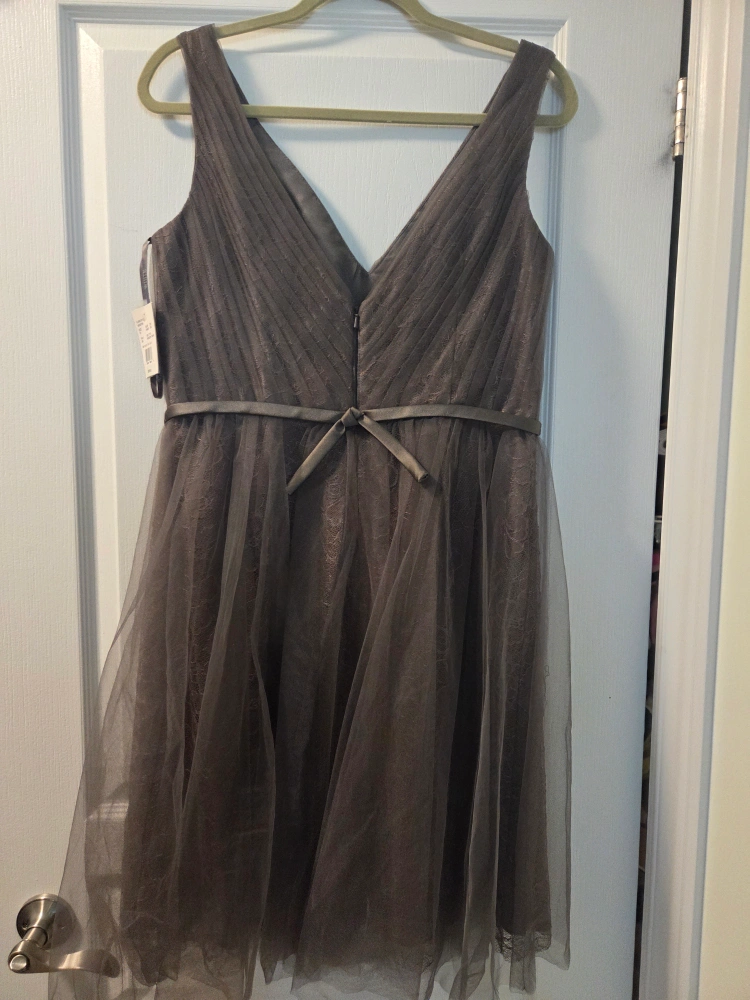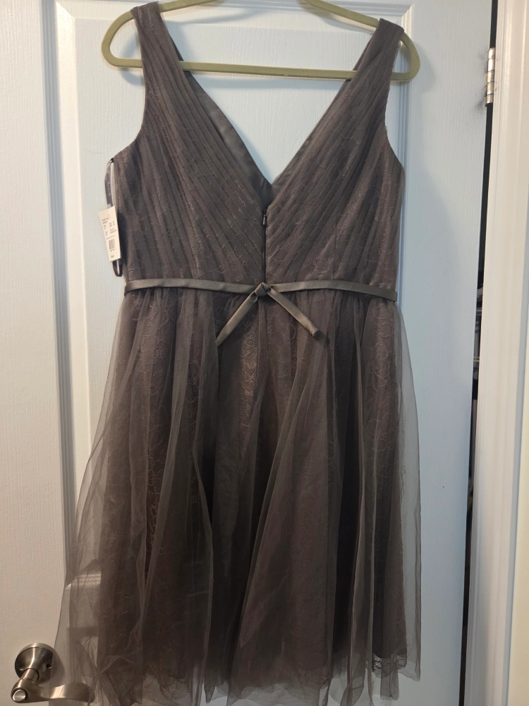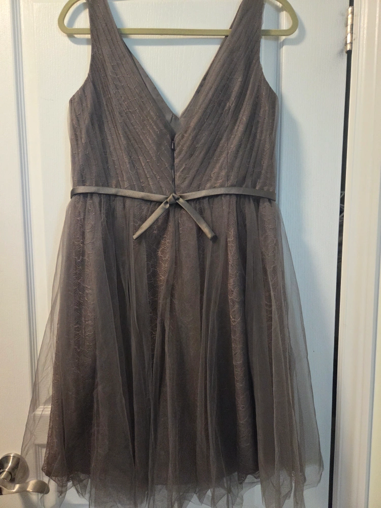 Features a V-neck and a ribbon around the waist. Has a layered, tulle skirt. The dress is a muted grey colour. A lovely outfit for a semi-formal event to make you feel your best. Bought it for $239.95