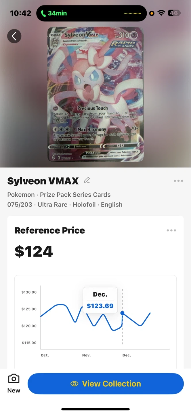 Selling a Sylveon VMAX Pokemon card from the Prize Pack Series. It's card number 075/203 and is an Ultra Rare Holofoil in English. The reference price is $124