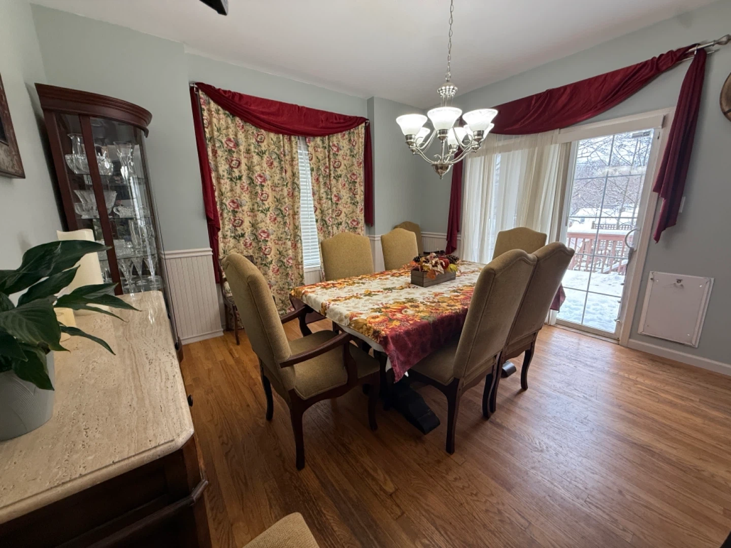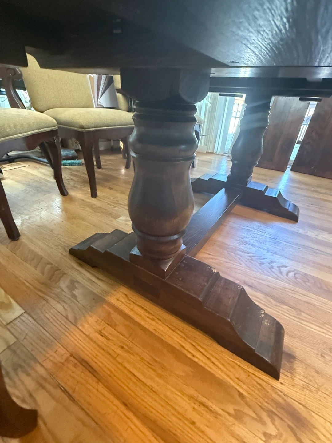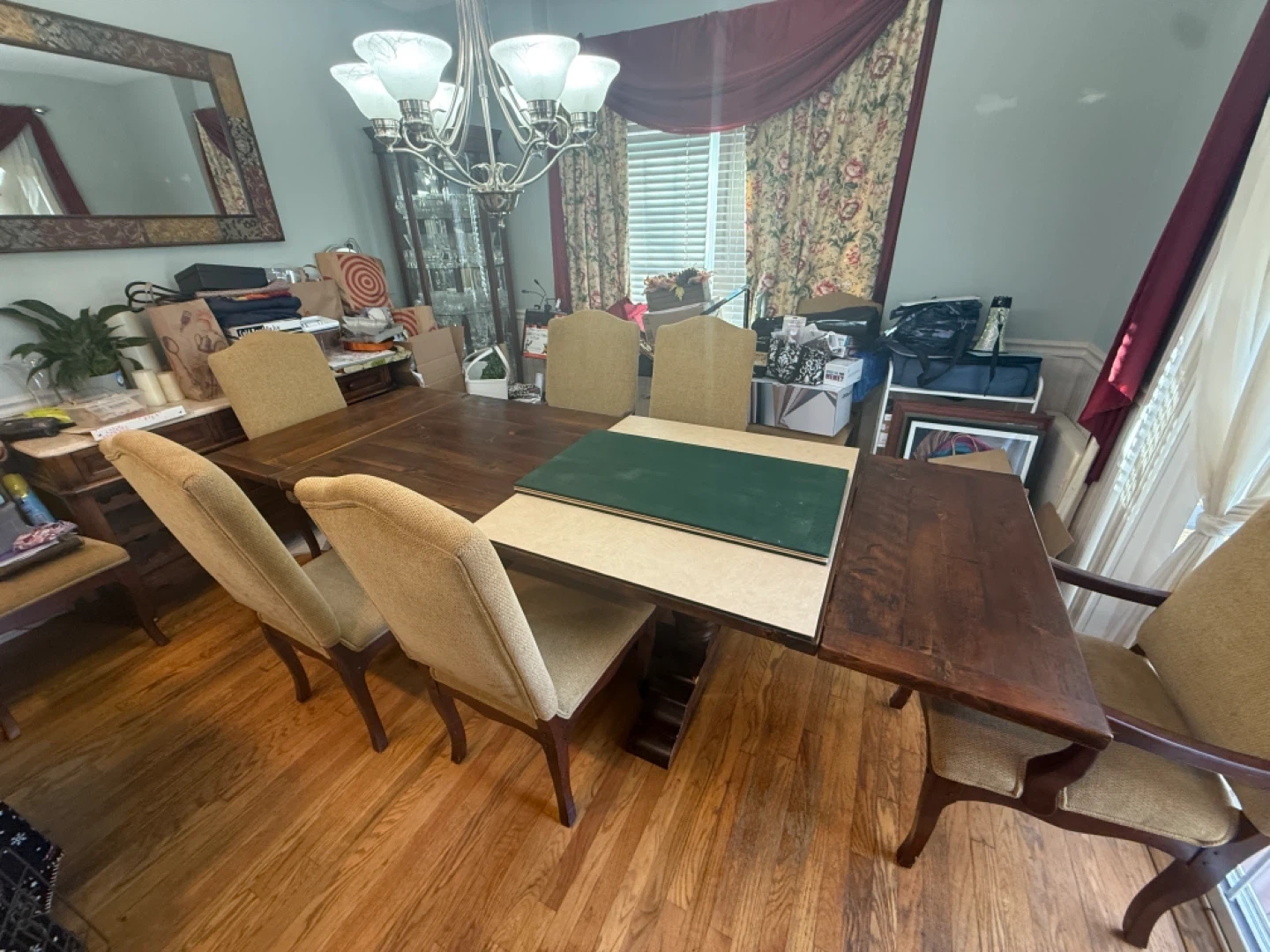 Selling a dining table, which includes a leaf to extend the table's length. It also comes with a green protective cover for the table's surface.