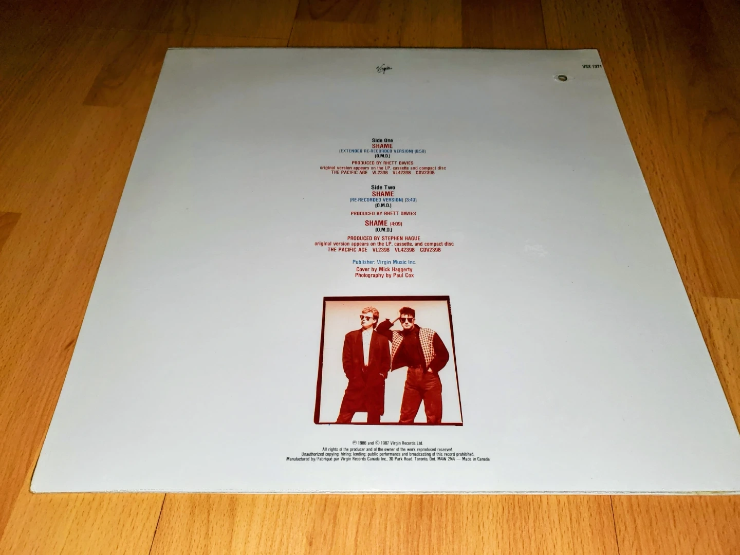 It includes the extended re-recorded version on Side One and the re-recorded version and original version on Side Two. Manufactured in Canada by Virgin Records Canada Inc. in 1987.