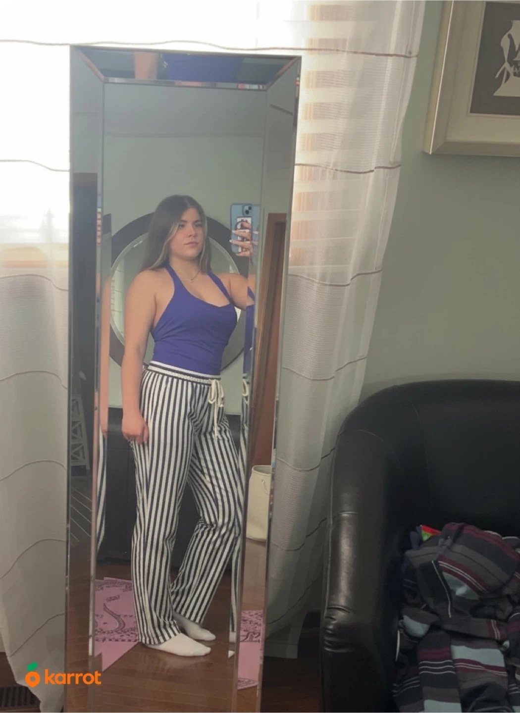 These are some comfy striped lounge pants! They're black and white and have a drawstring. Perfect for relaxing at home