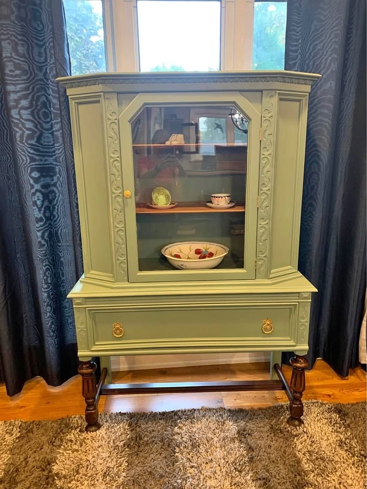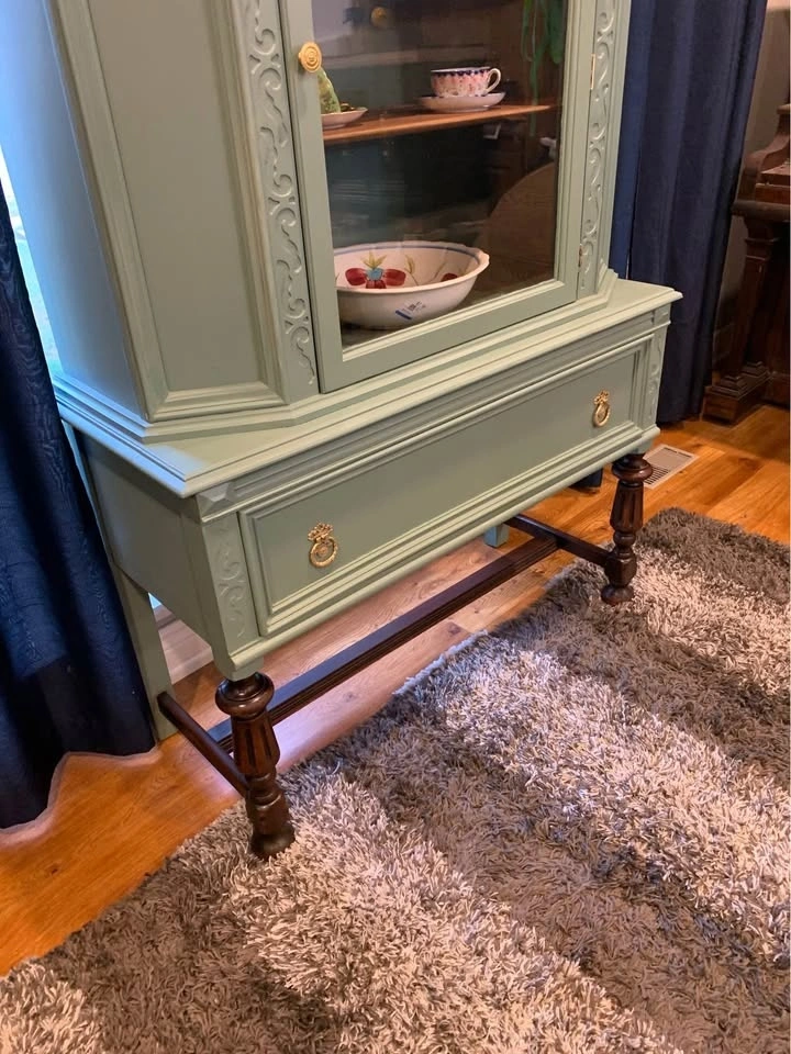 Whether country or city living, this refinished hutch will be a lovely addition to your space. It has been cleaned, primed, and painted in a soft green color. The legs and base have been stained in a dark walnut, and the entire piece has been top-coated for long-lasting protection and durability. Dimensions: Height- 62”, Width- 41 & 1/4”, Depth- 17”. Pick up in Brampton L6T2S6.