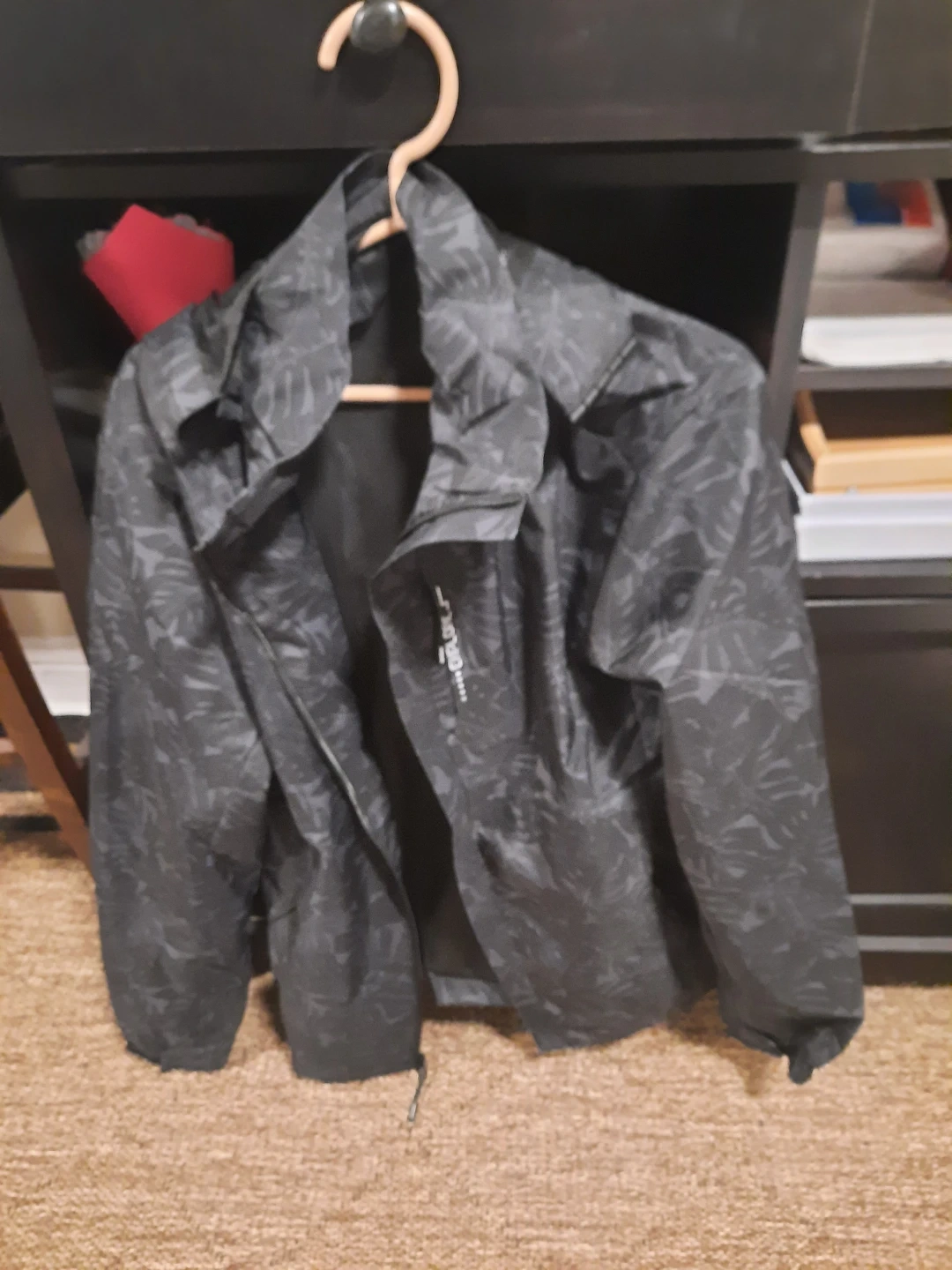 This is a men's zip-up jacket with a dark grey leaf pattern. It features a full zip closure and a stand-up collar. The material is lightweight and water-resistant. It's suitable for casual wear or light outdoor activities.