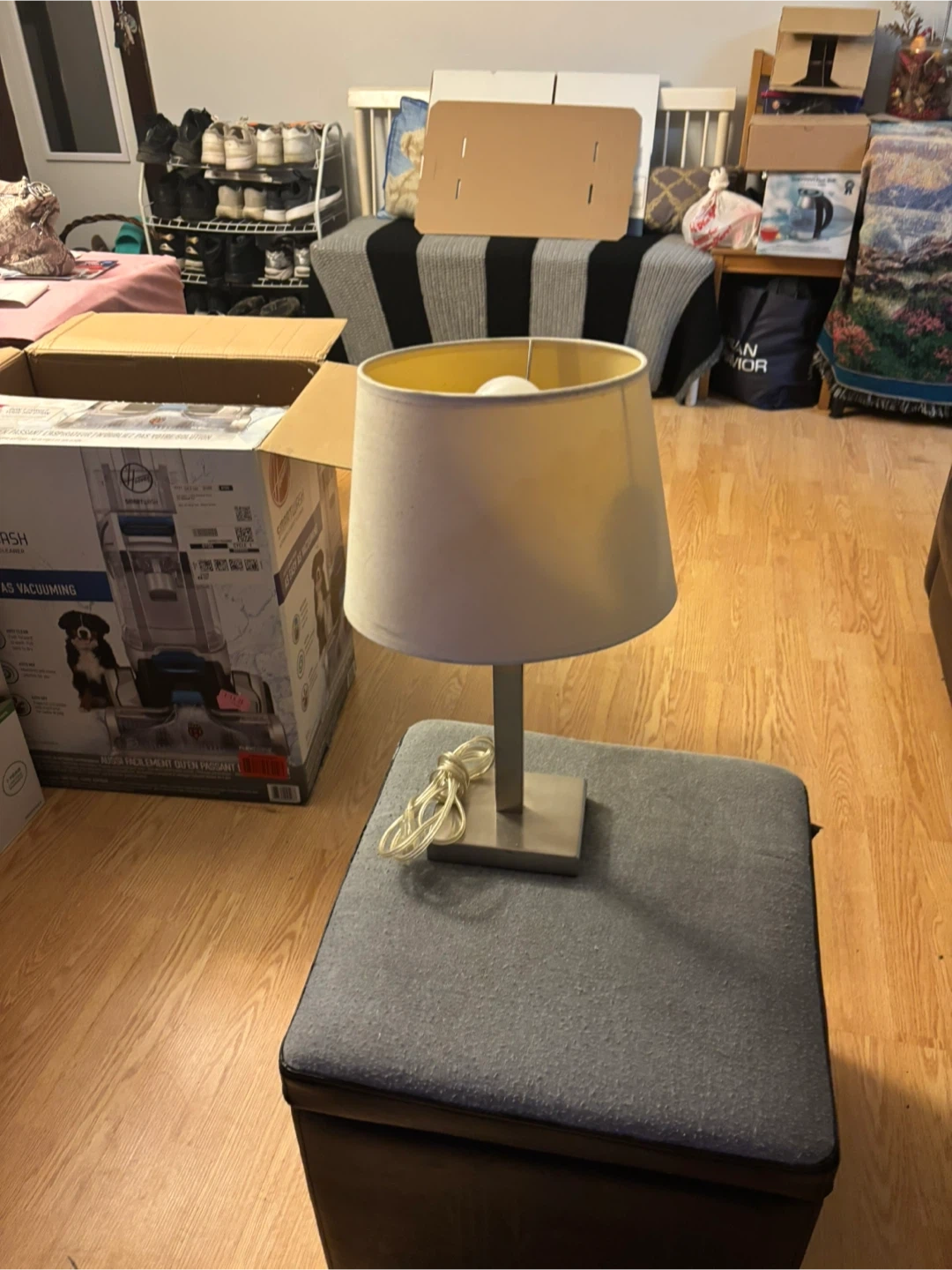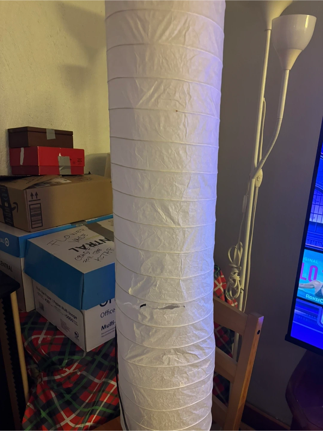 Tall white paper floor lamp. It has a flexible accordion-style paper shade. This lamp would fit well in a living room or bedroom. Power cord included. There is just a little rift as shown on the picture.