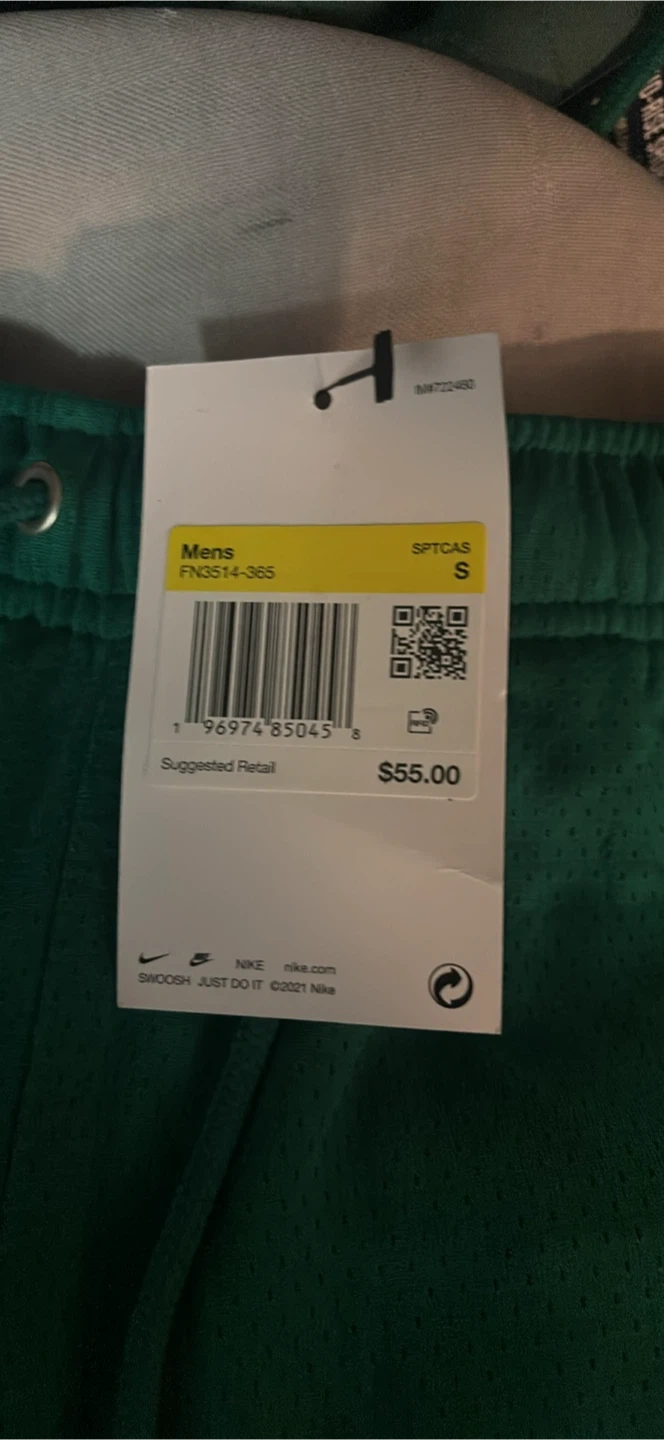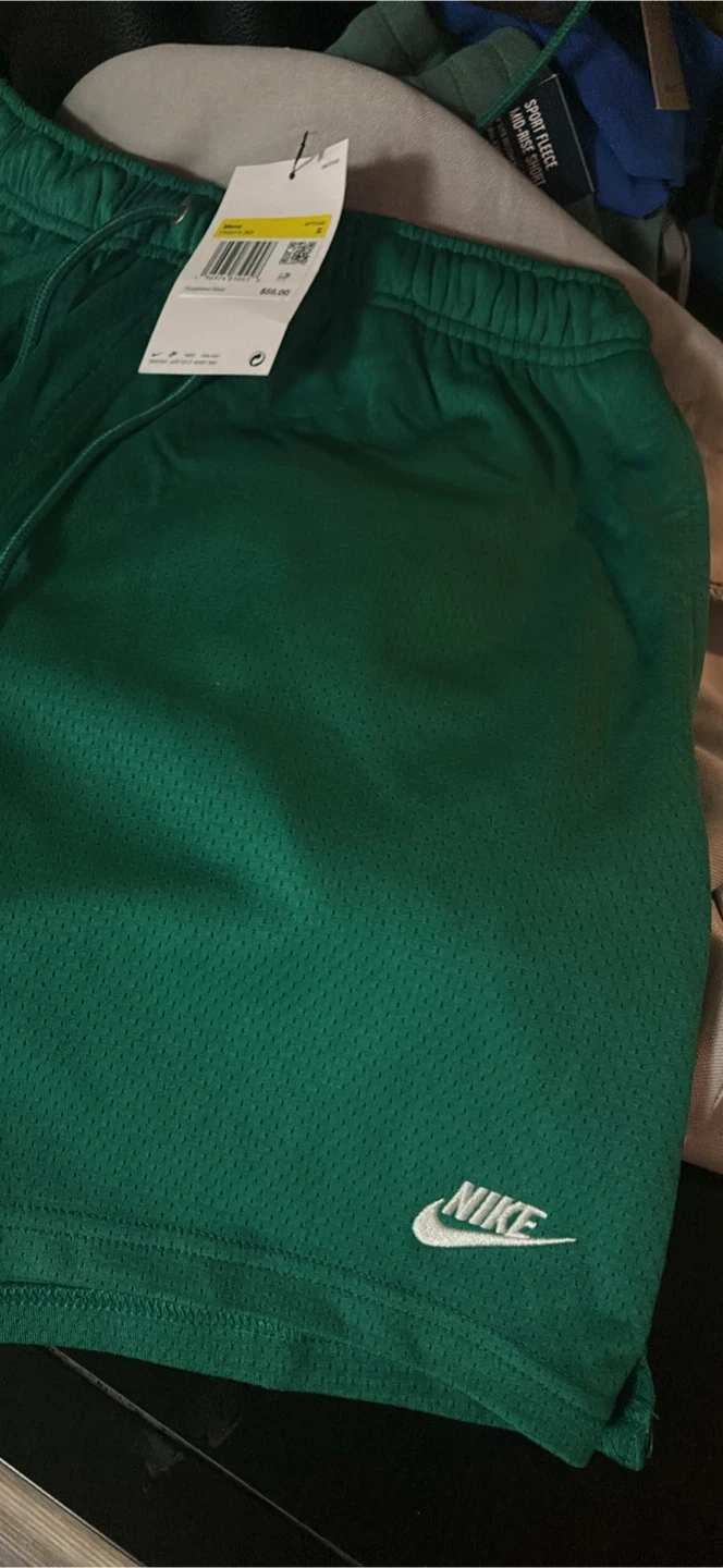 These are Nike men's green athletic shorts. They are a size small and made from a breathable mesh material. The drawstring waist ensures a comfortable fit.