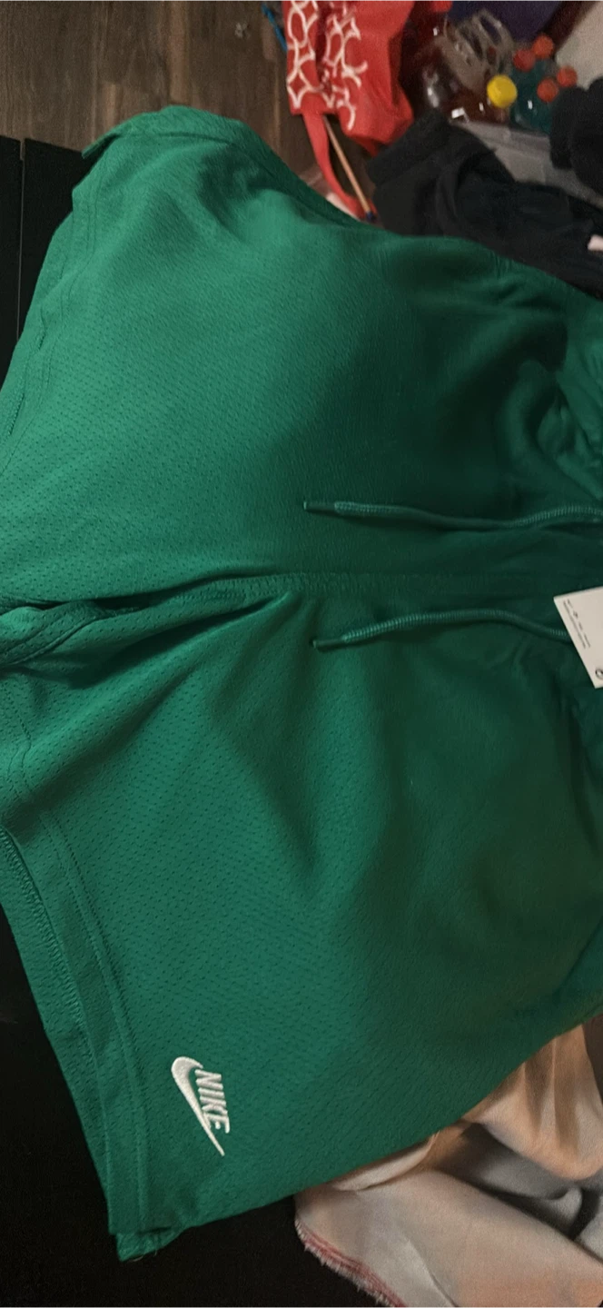 These are Nike men's green athletic shorts. They are a size small and made from a breathable mesh material. The drawstring waist ensures a comfortable fit.