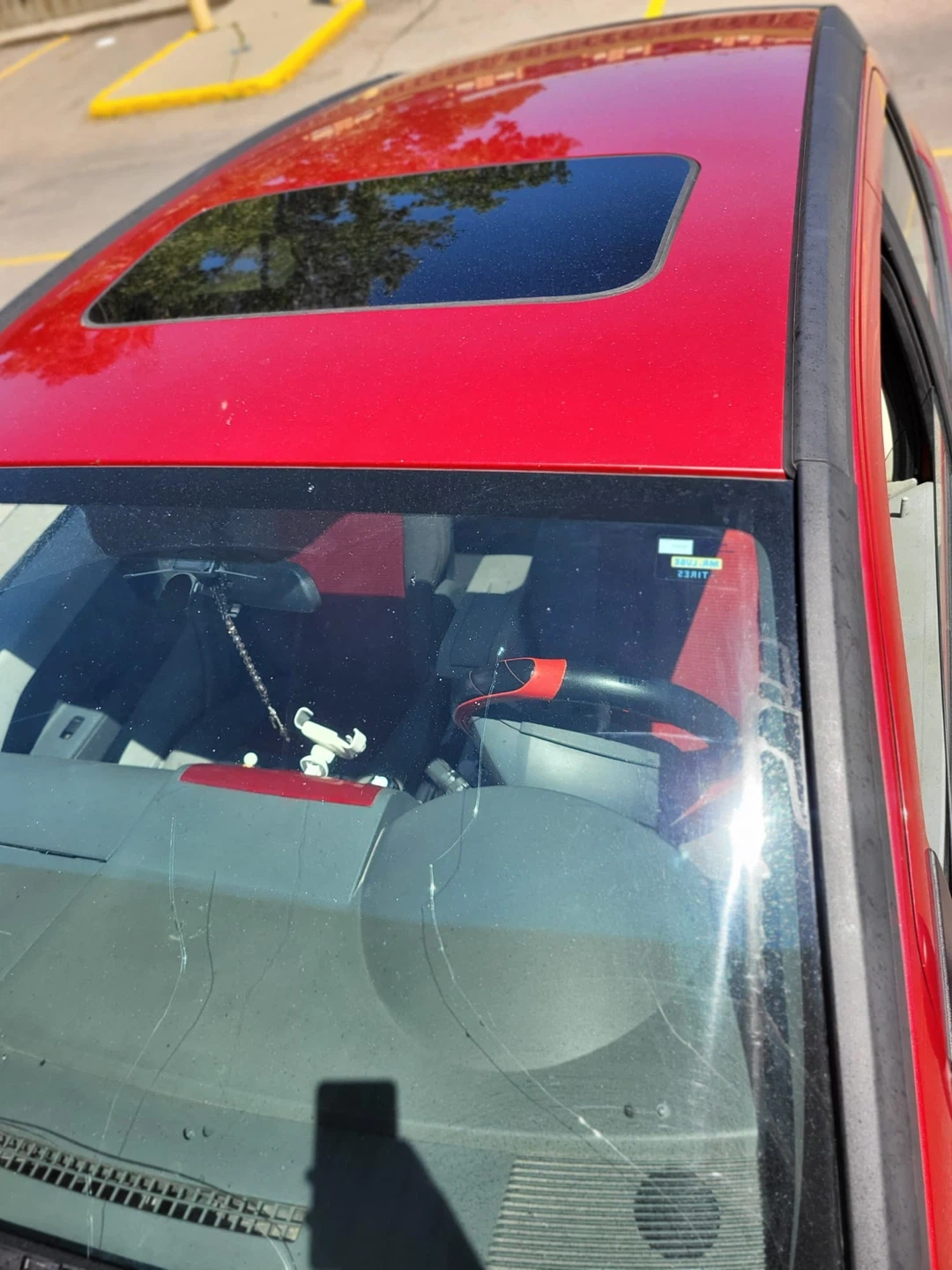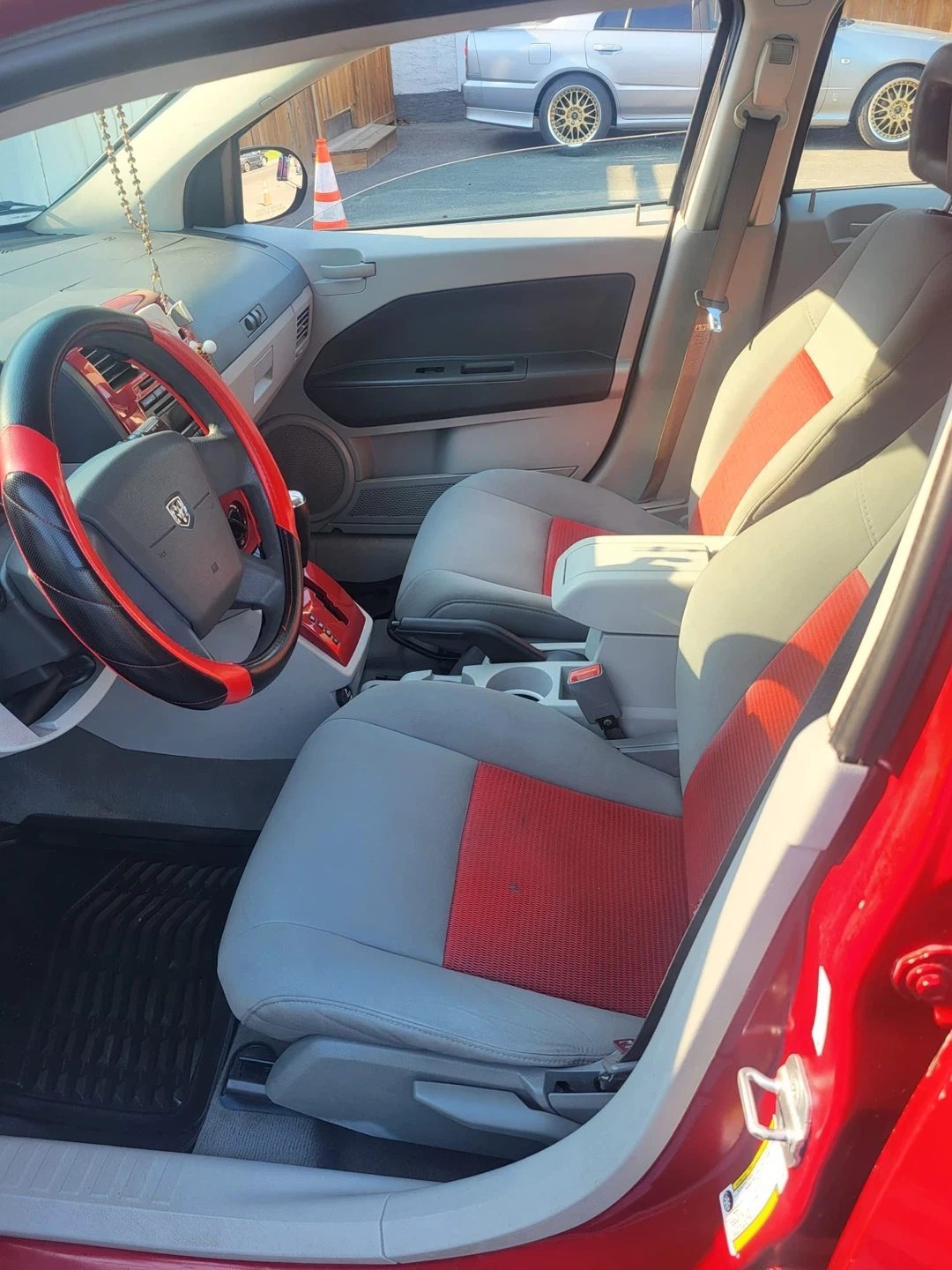 This is a red Dodge Caliber hatchback. It has a two-tone grey and red interior. The steering wheel has red accents.